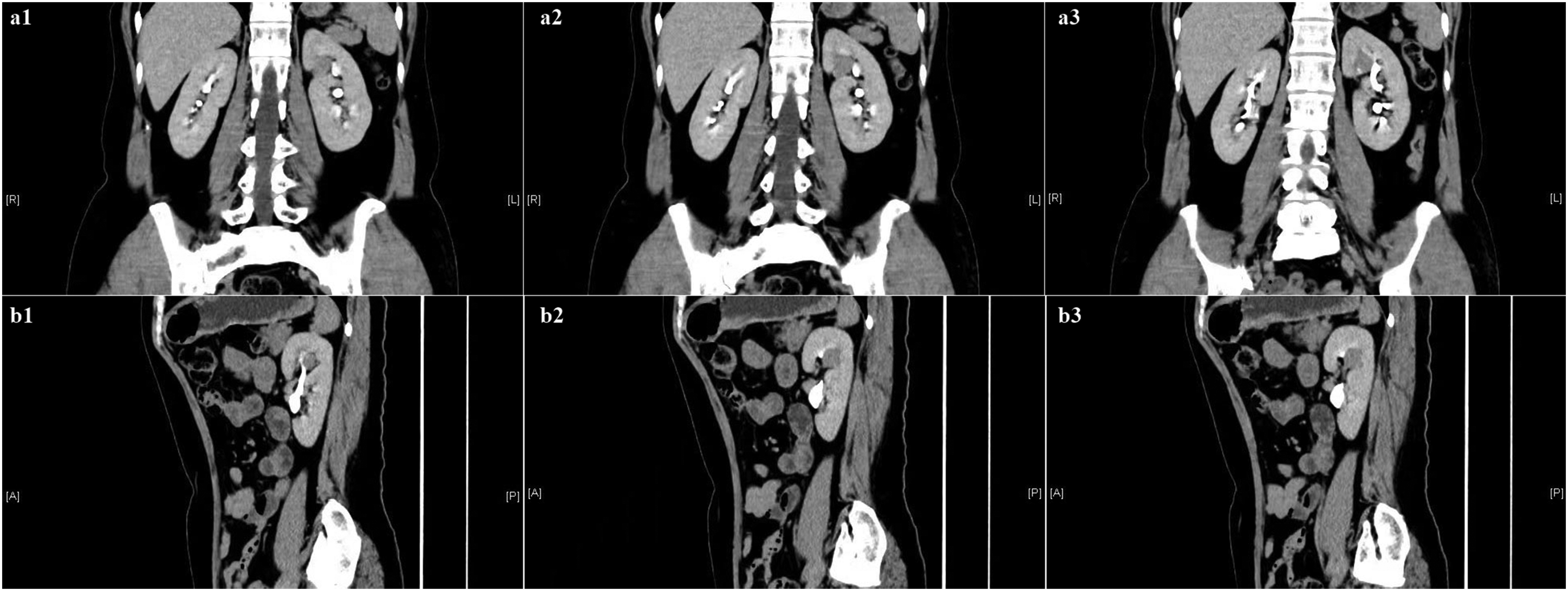 Preoperative computed tomography urography images. The contrast-enhanced scans showed heterogeneous enhancement of the tumor in the (a1–3) coronal and (b1–3) sagittal images; no enhancement was observed in the central necrotic area.
