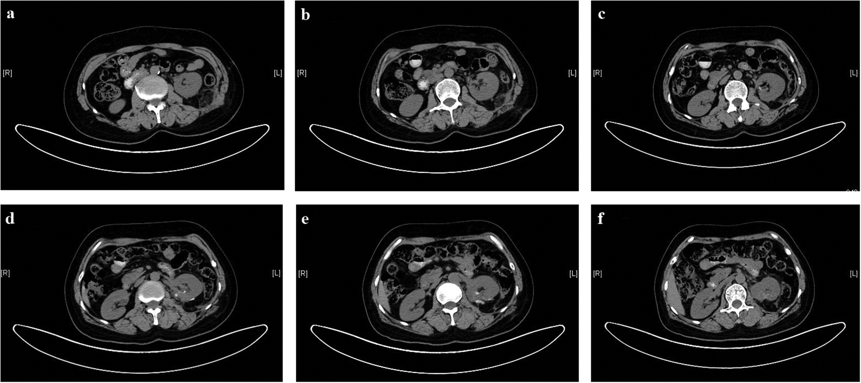 Postoperative computed tomography images. (a)–(f) The images show good recovery of the left kidney and no metastatic lesion in the opposite kidney.
