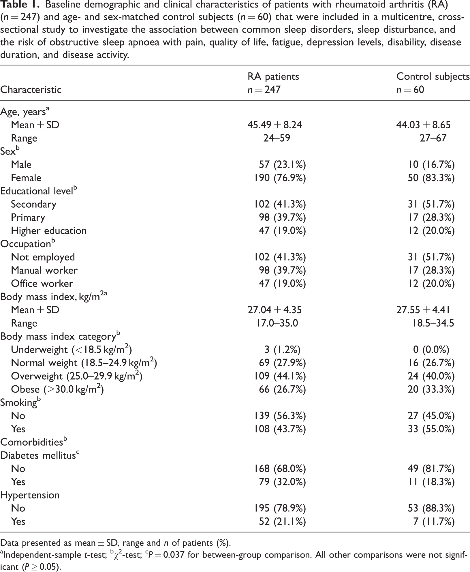 This multicentre, cross-sectional study enrolled patients with RA and sex- and age-matched control subjects. Clinical, sociodemographic, serological and therapeutic data were collected. Data from the Disease Activity Score (DAS28-CRP), the Epworth Sleepiness Scale (ESS), Pittsburgh Sleep Quality Index (PSQI), Berlin questionnaire, a visual analogue scale to evaluate fatigue severity (VAS-F), health assessment questionnaire disability index (HAQ-DI) and the Center for Epidemiological Studies-depression (CES-D) score were analysed.