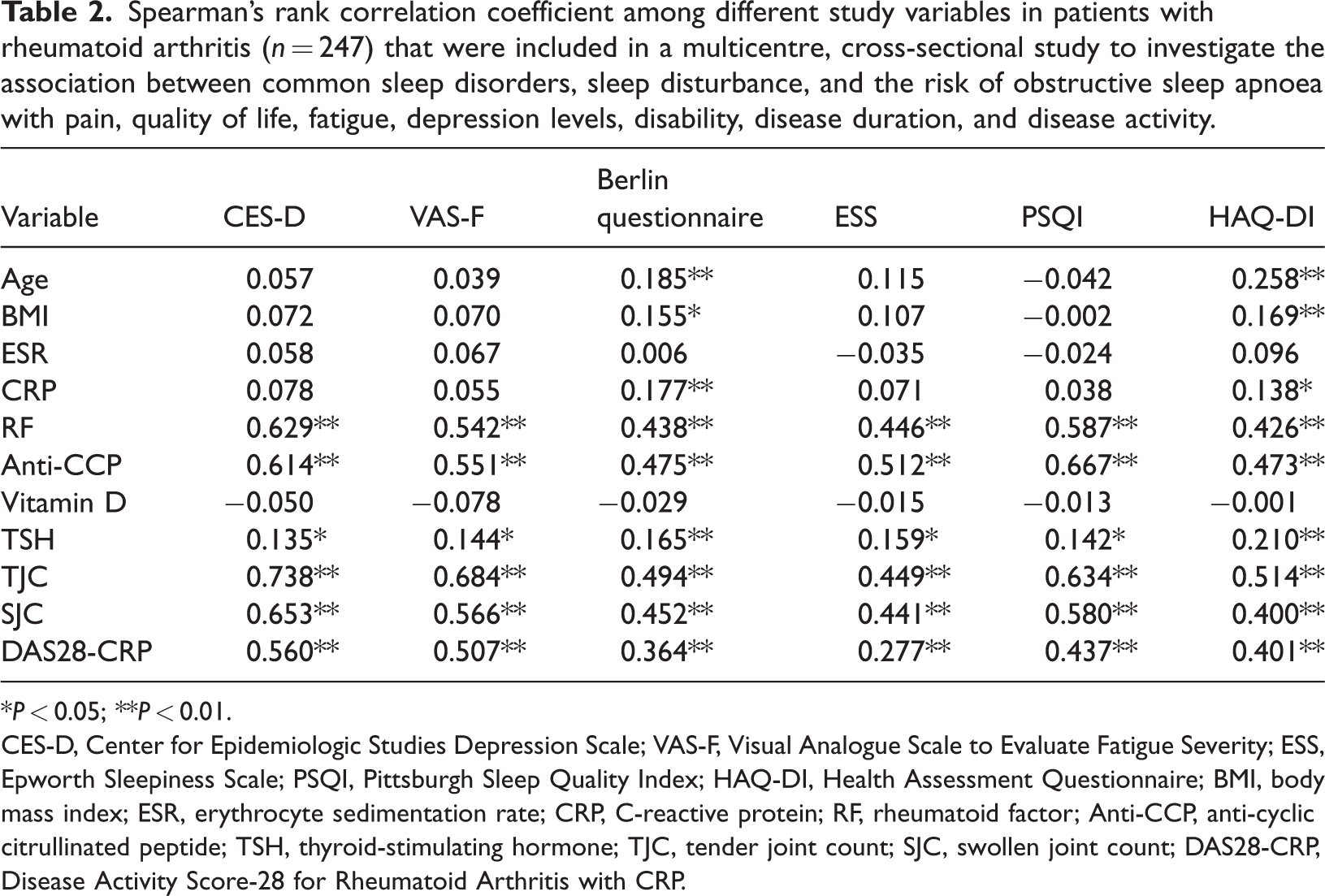 CES-D, Center for Epidemiologic Studies Depression Scale; VAS-F, Visual Analogue Scale to Evaluate Fatigue Severity; ESS, Epworth Sleepiness Scale; PSQI, Pittsburgh Sleep Quality Index; HAQ-DI, Health Assessment Questionnaire; BMI, body mass index; ESR, erythrocyte sedimentation rate; CRP, C-reactive protein; RF, rheumatoid factor; Anti-CCP, anti-cyclic citrullinated peptide; TSH, thyroid-stimulating hormone; TJC, tender joint count; SJC, swollen joint count; DAS28-CRP, Disease Activity Score-28 for Rheumatoid Arthritis with CRP.