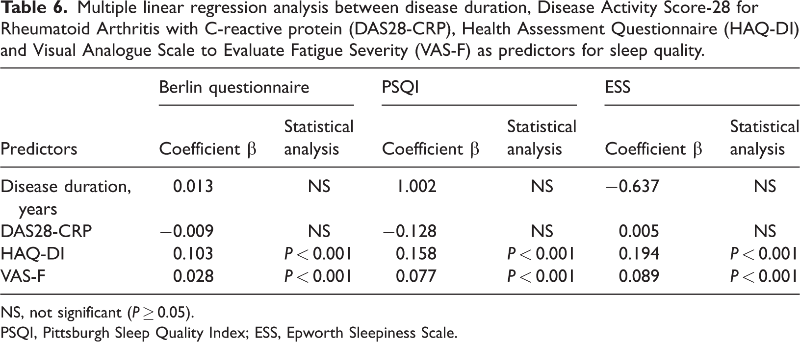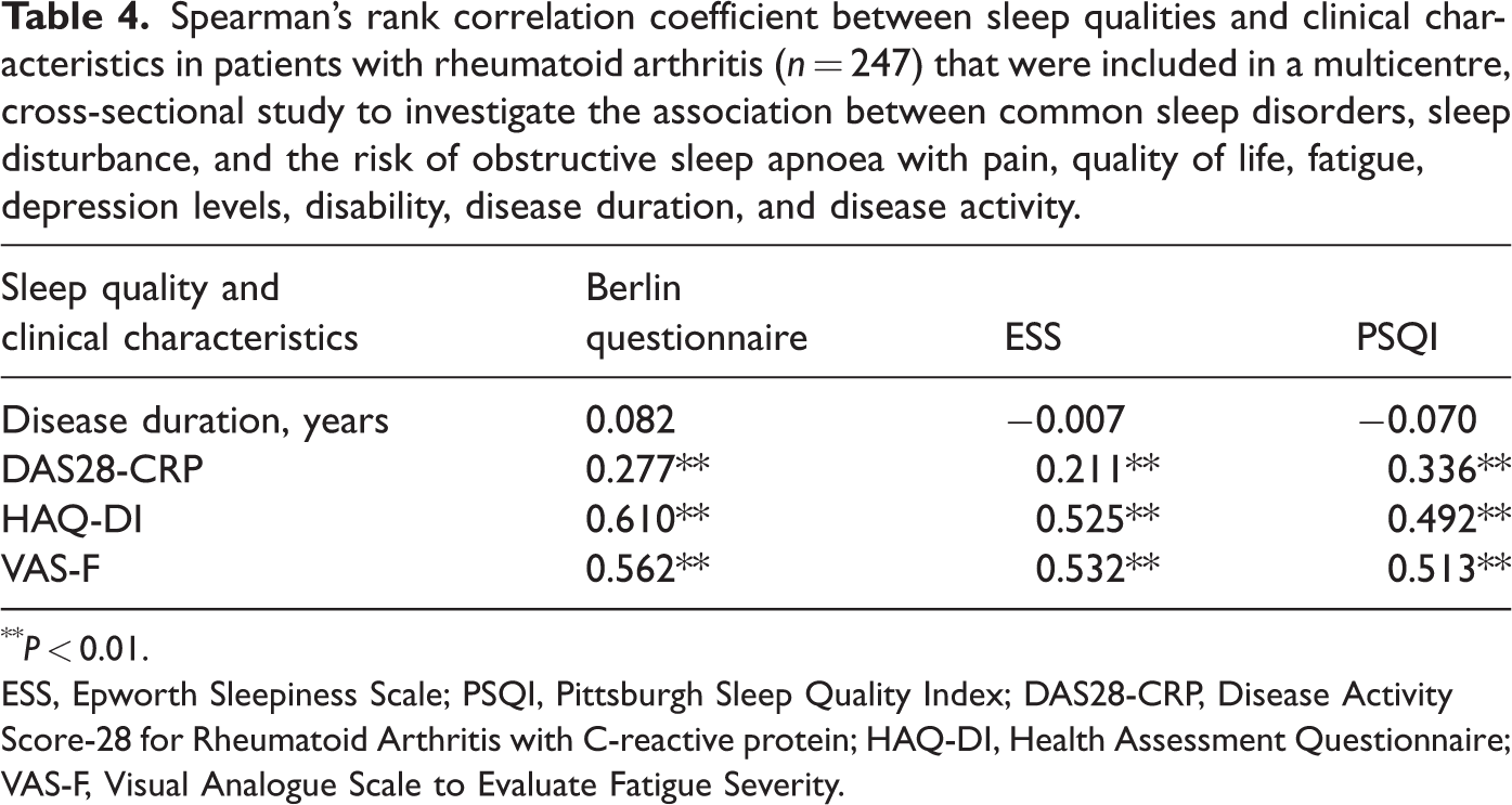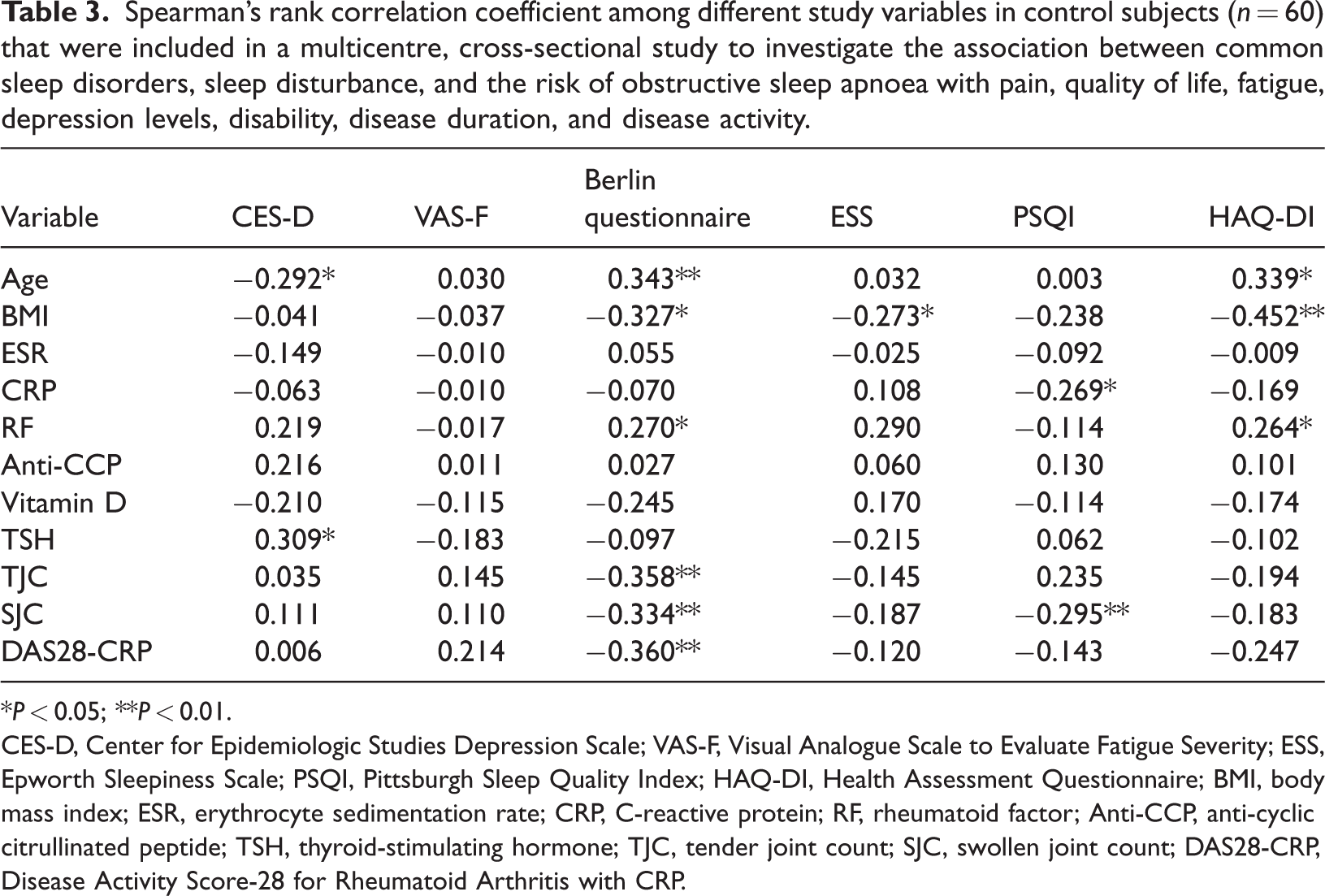 The study enrolled 247 patients with RA (190 females and 57 males) and 60 control subjects (50 females and 10 males). The PSQI for patients with RA was significantly associated with the DAS28-CRP, HAQ-DI and VAS-F. There was a significant correlation between the CES-D score, the Berlin questionnaire and the HAQ-DI and the age of control subjects. Multiple linear regression analysis demonstrated that HAQ-DI (coefficient β = 0.103) and VAS-F (coefficient β = 0.028) significantly predicted the risk of sleep apnoea.