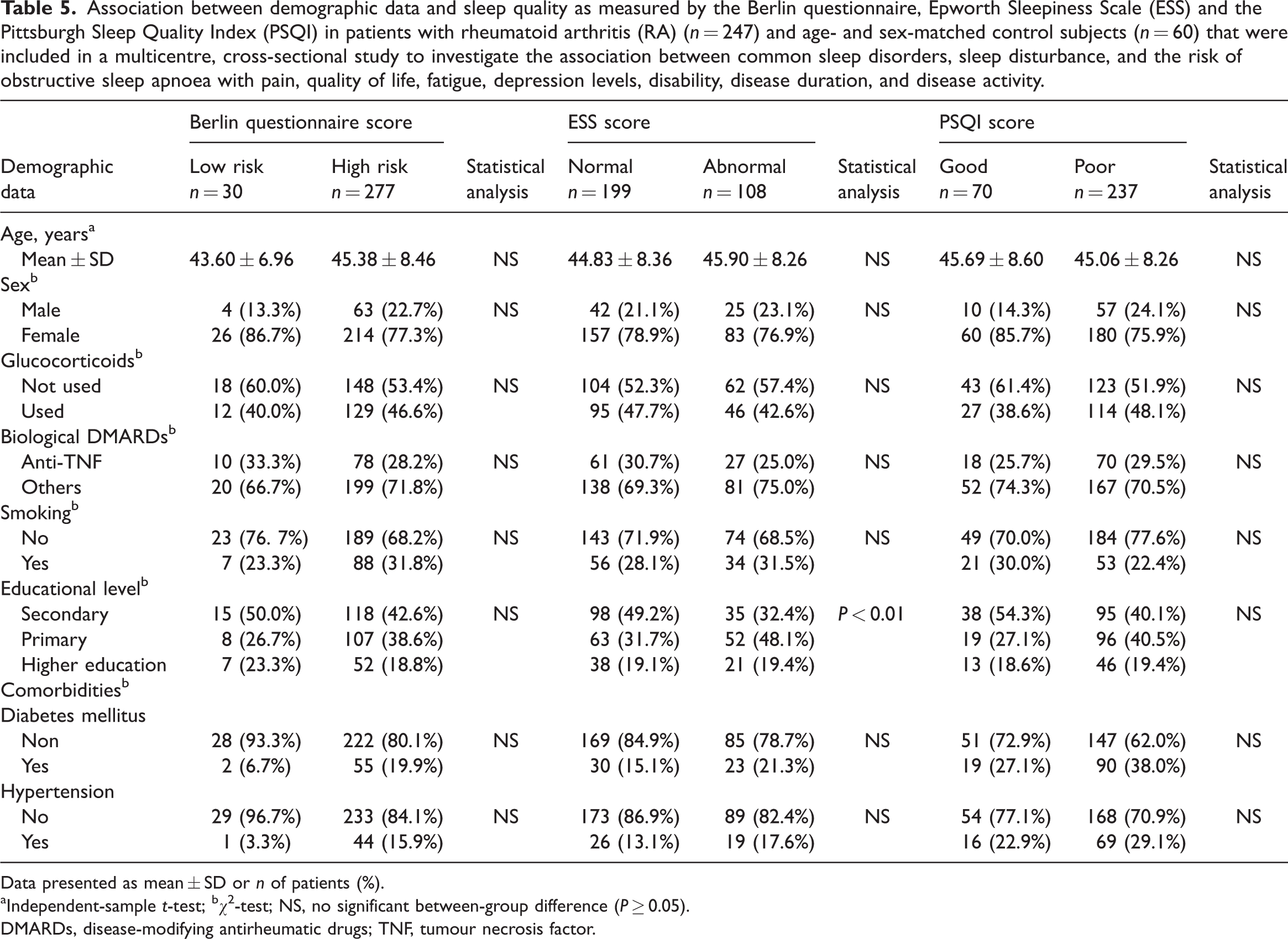 Association between demographic data and sleep quality as measured by the Berlin questionnaire, Epworth Sleepiness Scale (ESS) and the Pittsburgh Sleep Quality Index (PSQI) in patients with rheumatoid arthritis (RA) (