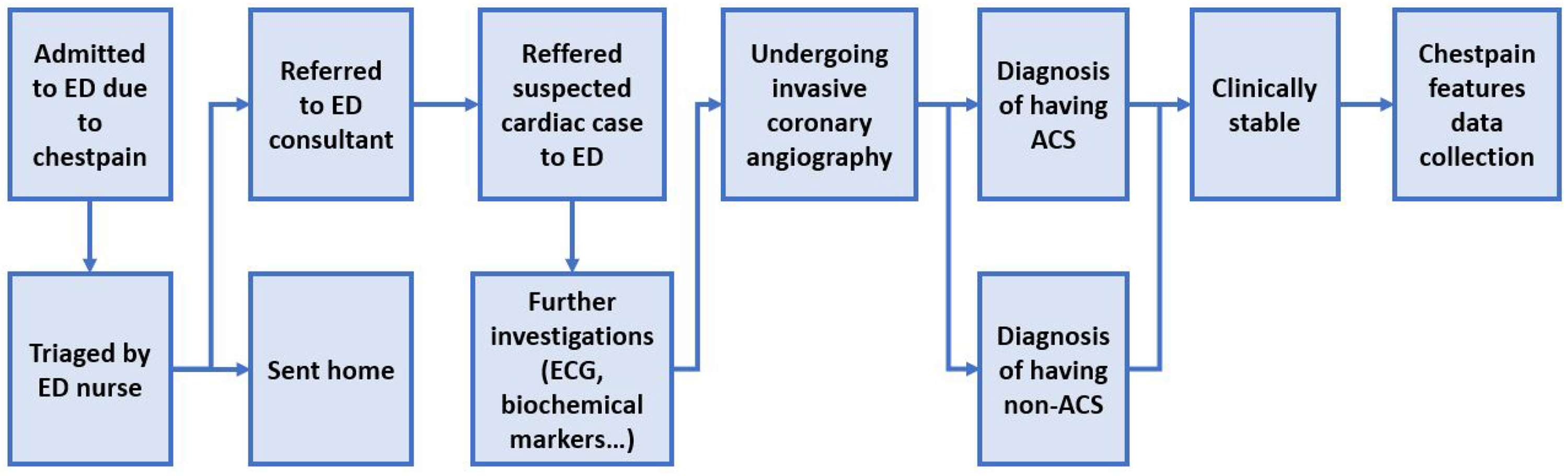 The inclusion criteria for this study were patients who presented with chest pain, underwent invasive coronary angiography, and were diagnosed with ACS (STEMI, non-STEMI, or unstable angina) by cardiologists. Diagnosis was based on coronary artery images showing vulnerable plaque or vessel occlusion during angiography, along with other diagnostic tools such as 12-lead electrocardiography and initial biomarker tests. The cases comprised patients who presented with chest pain, underwent invasive coronary angiography, and were classified as non-ACS by interventional cardiologists. This classification was based on the absence of detectable coronary artery damage in imaging and findings from other diagnostic tools, including 12-lead electrocardiography and initial biomarker tests. The exclusion criteria were hemodynamic instability, ventilator dependence, and refusal to participate. The study used a total sampling technique, including all eligible patients who met the inclusion criteria. Trained nursing students conducted patient interviews 24 hours after coronary angiography in the Emergency Department of the Vietnam National Heart Institute. Based on these criteria, a sample size of 270 patients was obtained. The clinical workflow for this study is shown in Figure 1.