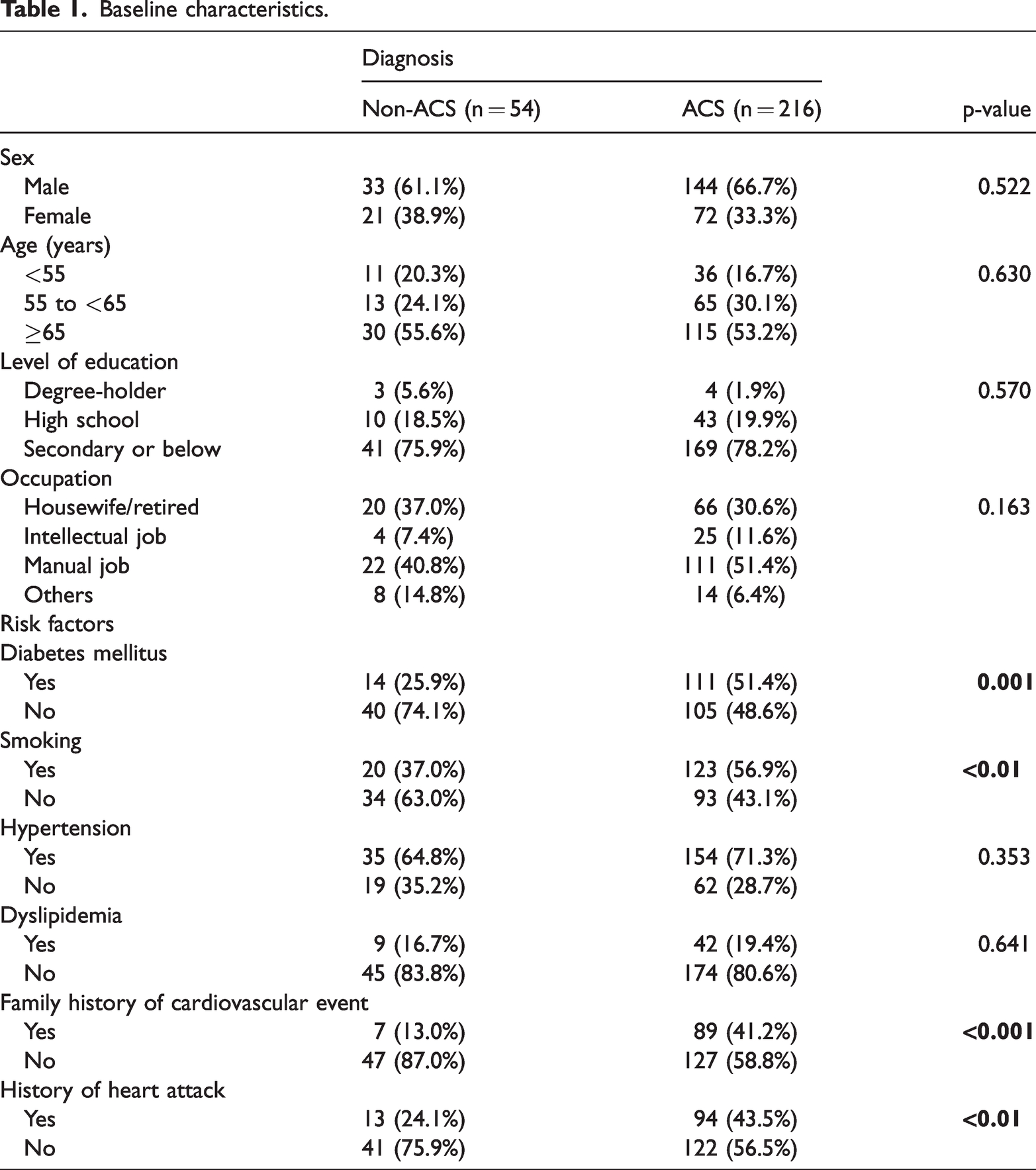 This study involved 270 patients (54 without ACS and 216 with ACS), with baseline characteristics detailed in Table 1, including demographic and clinical data. No significant differences were found in age, sex, education, or occupation. Chest pain in non-ACS and ACS patients showed no statistically significant differences in hypertension or dyslipidemia. However, the non-ACS group had significantly fewer classic ACS risk factors, such as type 2 diabetes, a family history of cardiovascular events, and a personal cardiovascular history (p < 0.05).