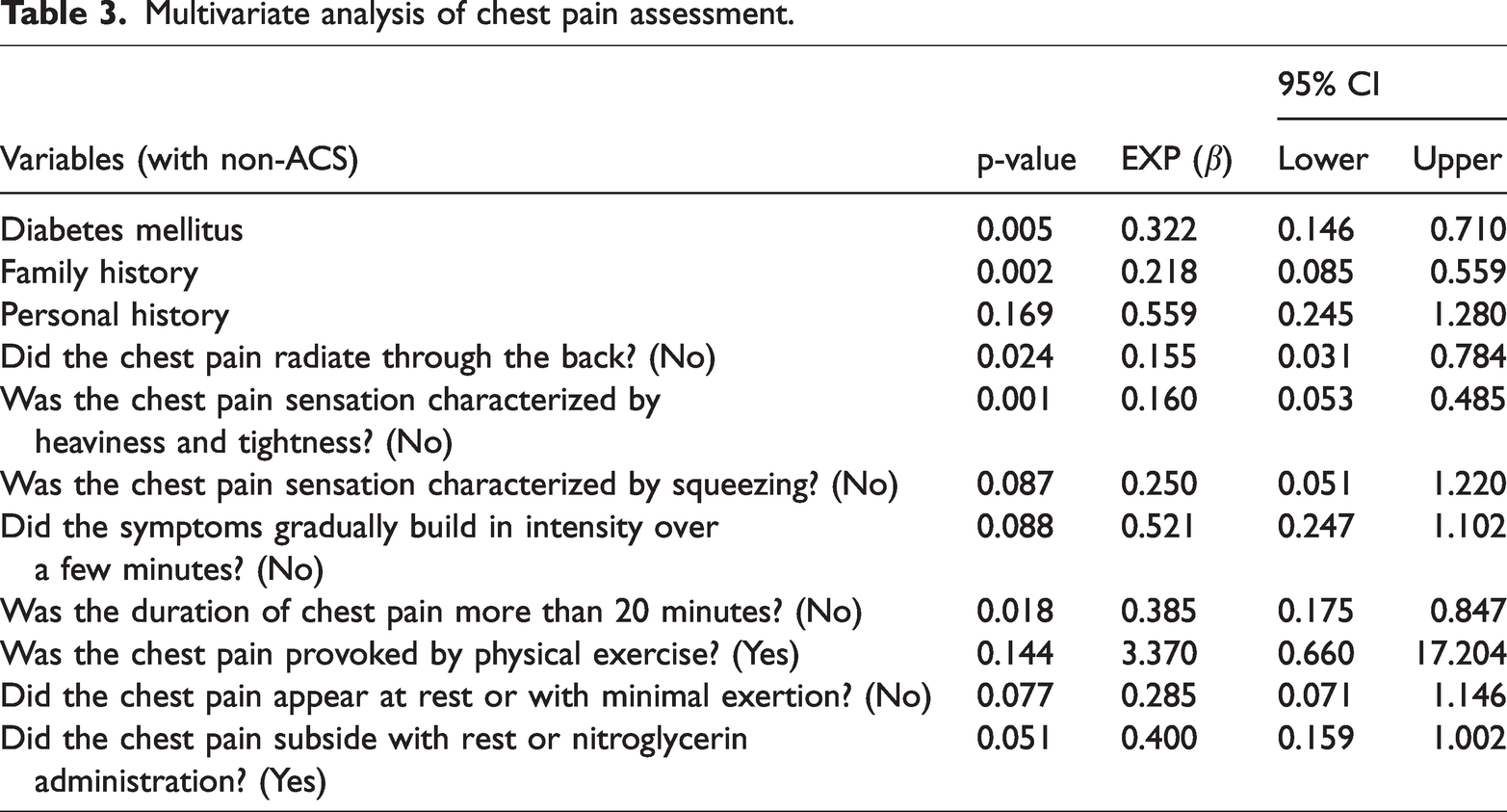 Multivariate analysis of chest pain assessment.