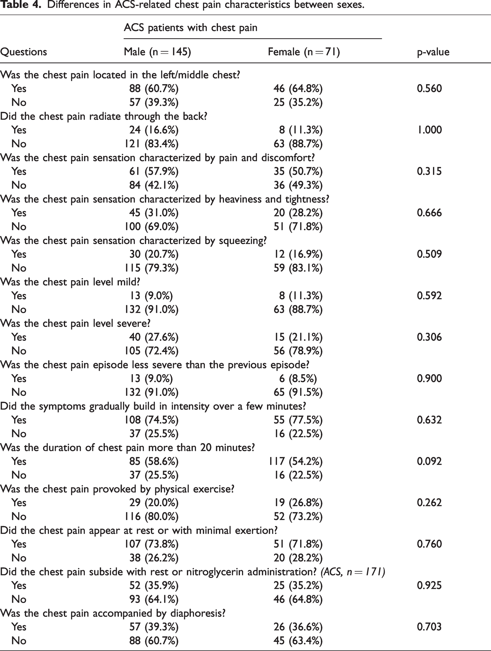 Table 4 presents data on sex-related differences in ACS-related chest pain characteristics. No significant differences were observed between the sexes.