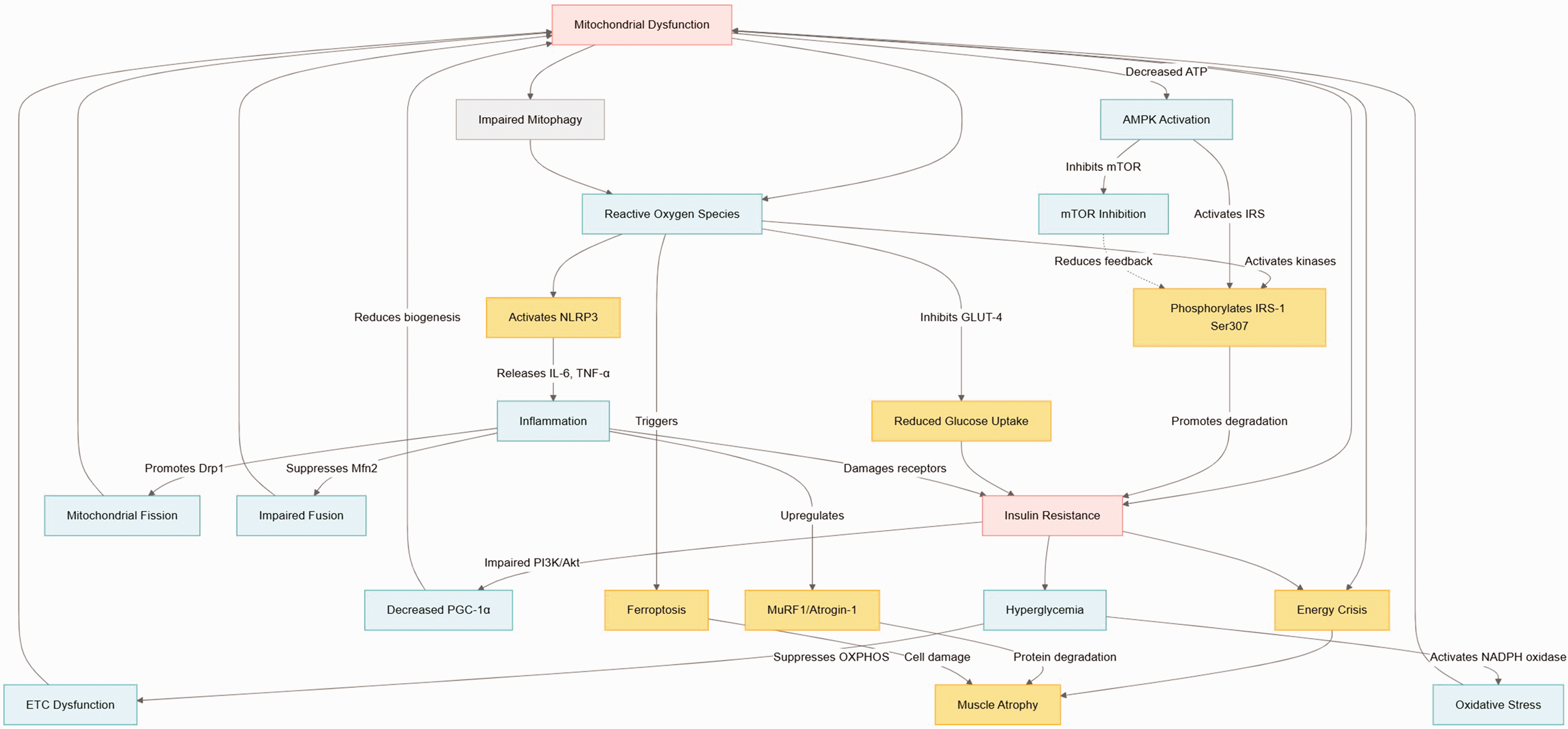 Mitochondrial dysfunction directly disrupts cellular energy metabolism. Under normal conditions, muscle cells rely on mitochondrial oxidative phosphorylation to generate ATP, meeting the energy demands of muscle contraction and other physiological activities. However, in diabetes, hyperglycemia and insulin resistance impair oxidative phosphorylation, leading to ETC dysfunction, suppression of aerobic respiration, and significant reduction in ATP production. As muscle contraction depends on an adequate ATP supply, energy deficiency weakens muscle contractility, ultimately leading to muscle atrophy and functional decline.