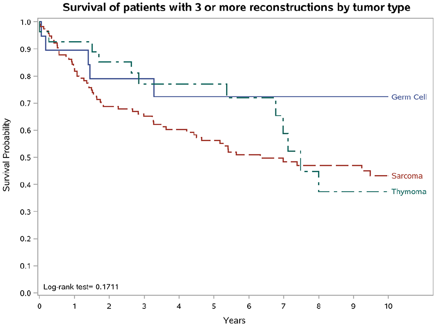 Survival of patients with three or more reconstructions by tumour type.