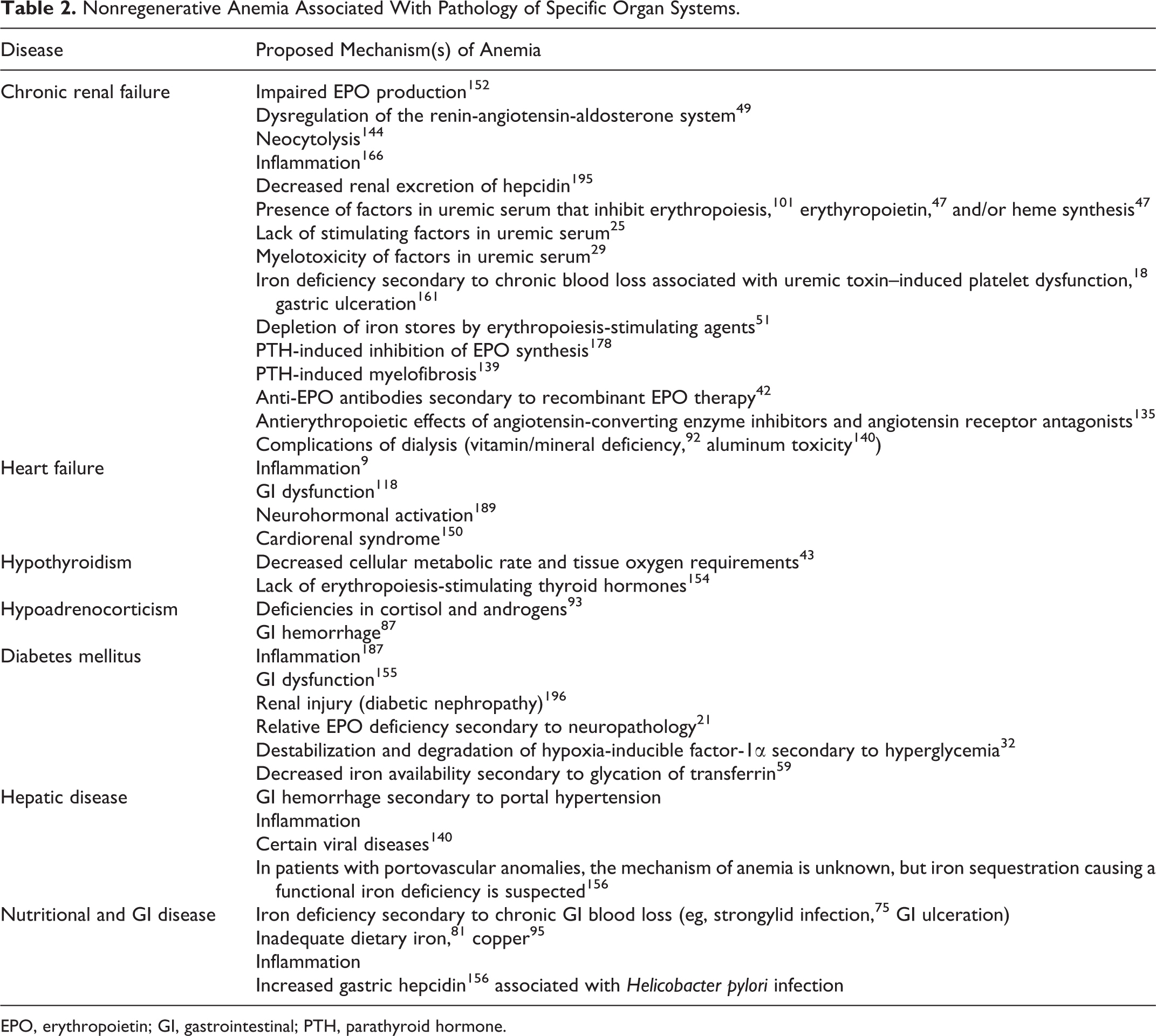The information above about mechanisms of nonregenerative anemia is organized by disease process; information organized by pathology of specific organ systems is presented in Table 2.
