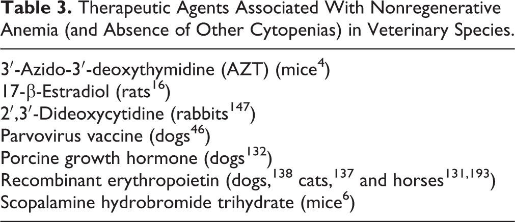 Therapeutic Agents Associated With Nonregenerative Anemia (and Absence of Other Cytopenias) in Veterinary Species.