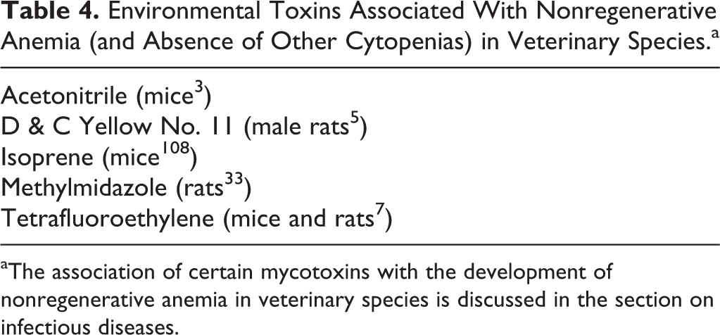 Environmental Toxins Associated With Nonregenerative Anemia (and Absence of Other Cytopenias) in Veterinary Species.a