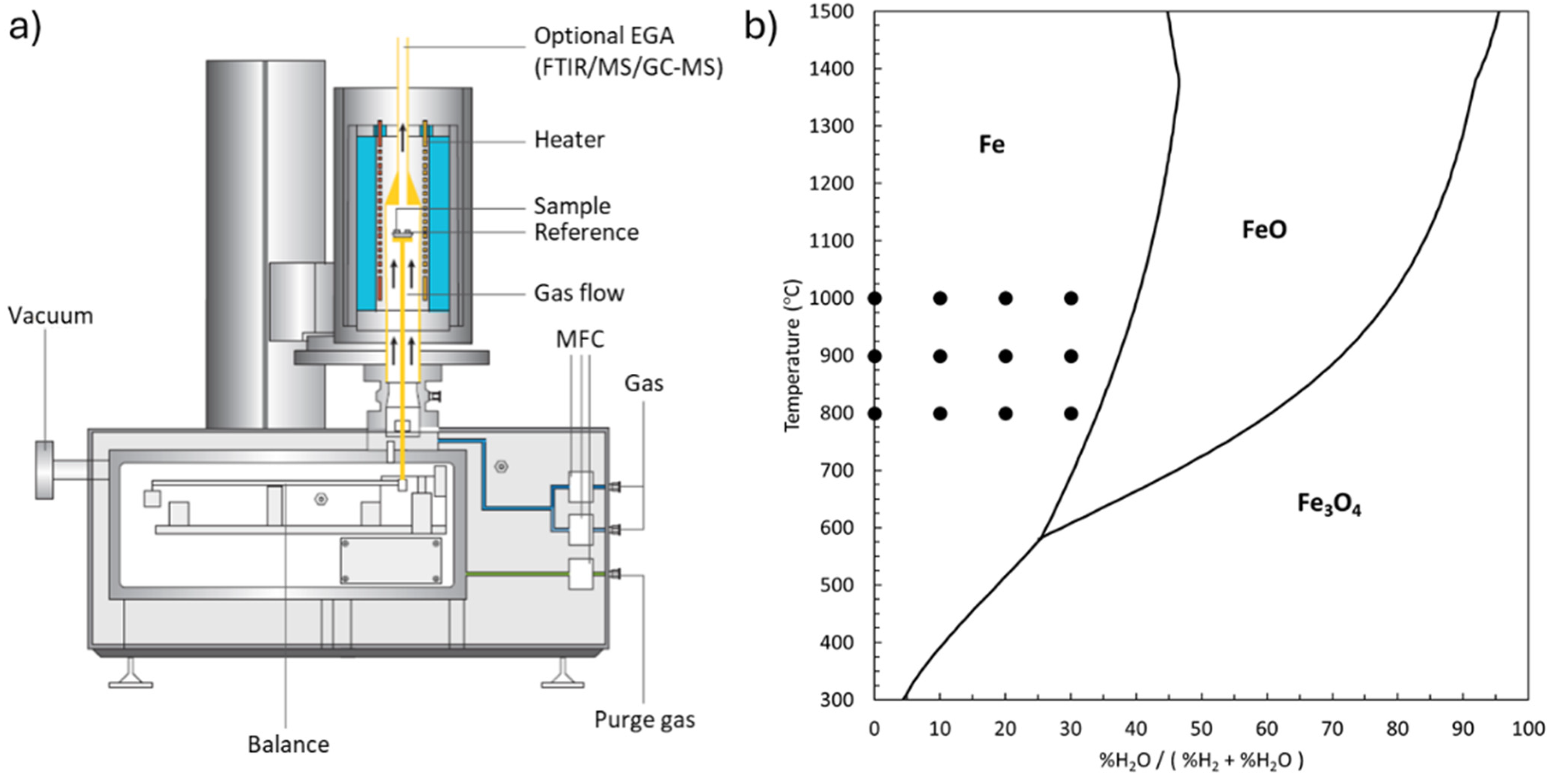 (a) Schematic of utilised TG-DSC device (Linseis STA PT 1600), and (b) Baur–Glaessner diagram. Each point represents one isothermal experiment (calculated with HSC Chemistry version 10.4.1.1).