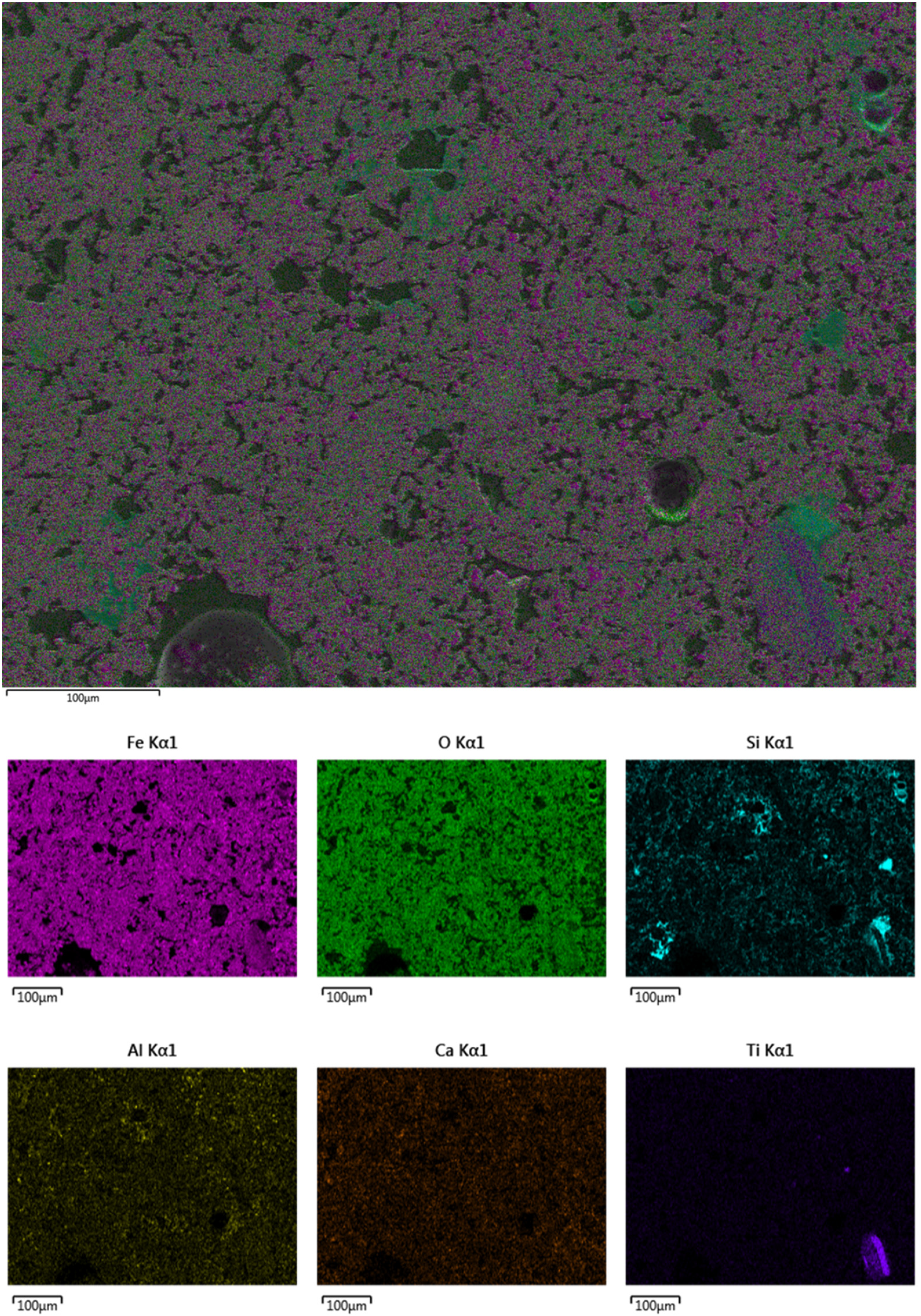 Figure 4 presents the initial microstructure of the unreduced pellets, revealing grains up to 20 μm in size surrounded by micropores. Energy-dispersive X-ray spectroscopy (EDX) elemental mapping in the SEM images confirms that hematite is the primary component of the pellets. Additionally, the main gangue minerals present include SiO2, Al2O₃, CaO and TiO2. While Al2O₃ and CaO are evenly distributed throughout the structure, SiO2 and TiO2 tend to concentrate in specific regions, particularly along grain boundaries.