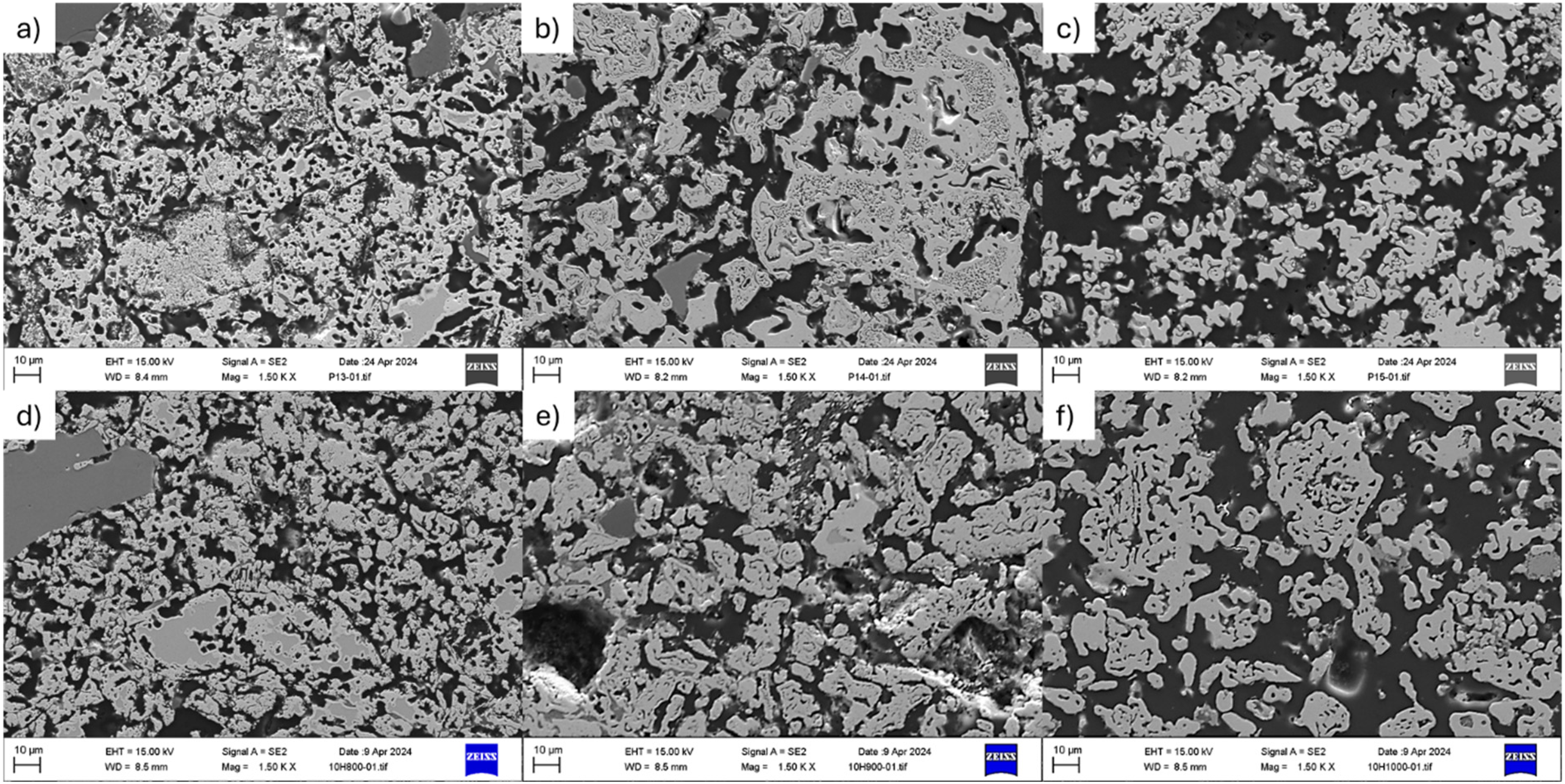 FESEM images of reduced pellets with 100% H2 at (a) 800°C, (b) 900°C and (c)1000°C, and reduced pellets with 90% H2 + 10% H2O at (d) 800°C, (e) 900°C and (f) 1000°C.