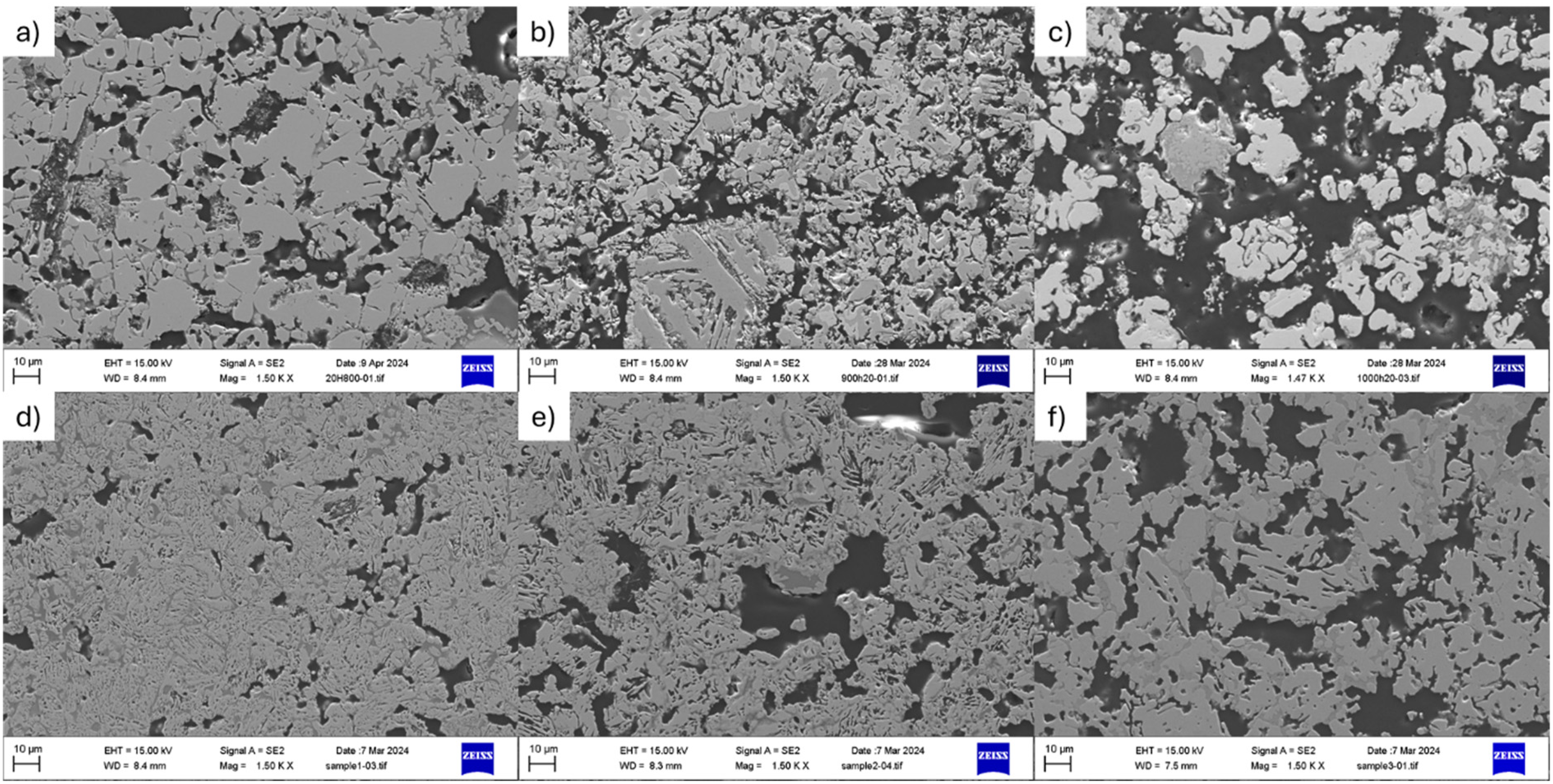 FESEM images of reduced pellets with 80% H2 + 20% H2O at (a) 800°C, (b) 900°C and (c) 1000°C, and reduced pellets with 70% H2 + 30% H2O at (d) 800°C, (e) 900°C and (f) 1000°C.