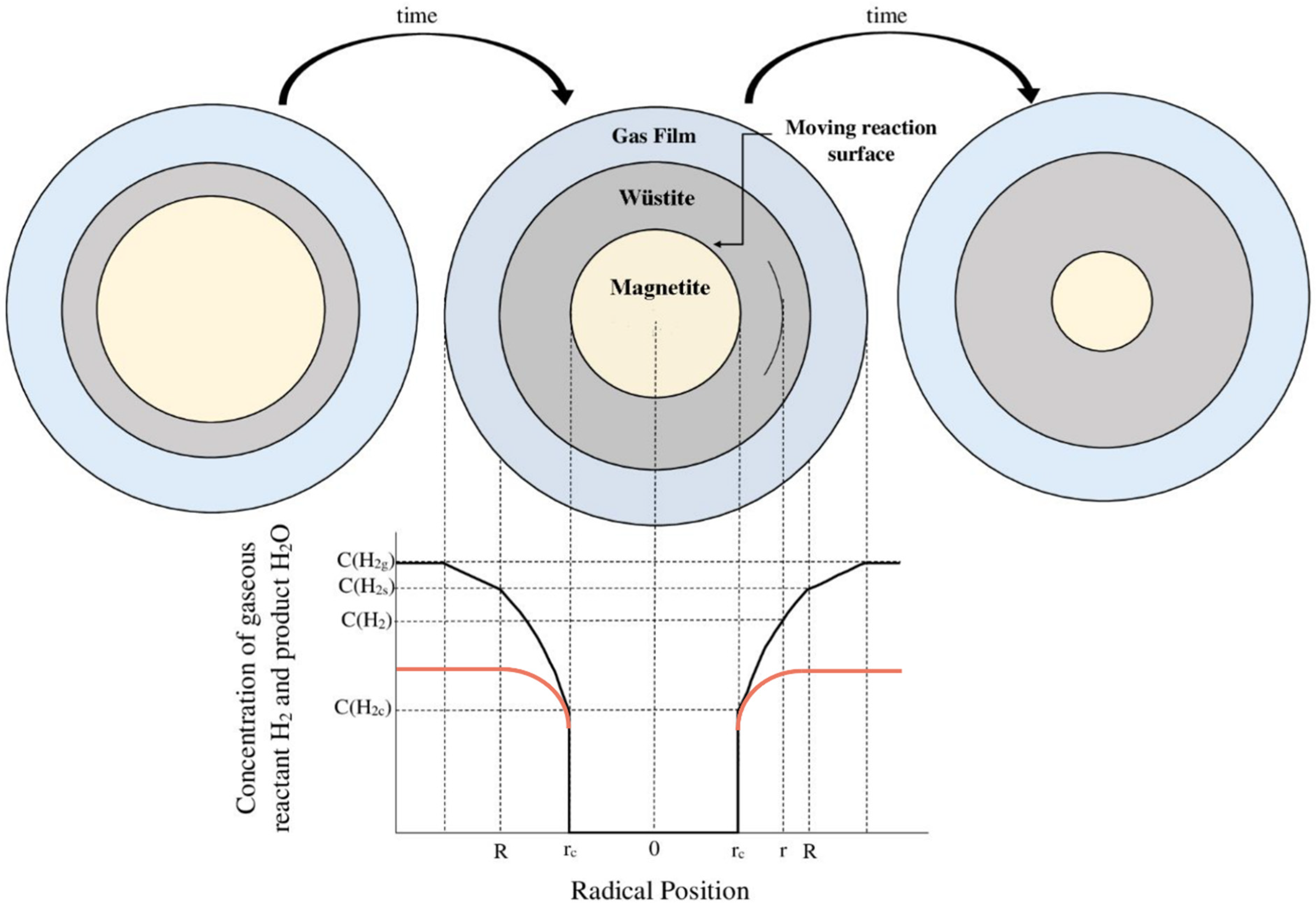 Figure 1(b) shows that even with 30% water vapour, complete reduction should be achieved at the thermodynamic equilibrium. However, the reduction curves and FESEM images show that there is a kinetic barrier that prevents the full reduction. Previous studies suggest that the reduction of wüstite to iron involves multiple kinetic steps: (1) diffusion of H2 molecules to the pellet surface; (2) reaction with oxygen atoms at the external surface of the Fe layer to form water; (3) removal of H2O from the surface; (4) diffusion of oxygen atoms through the Fe layer driven by an oxygen activity gradient, away from the FeO/Fe reaction front where the FeO ↔ Fe + O equilibrium exists; and (5) nucleation of Fe accompanied by the continuous release of oxygen at the internal reaction front. 27 As the partial pressure of water vapour (PH2O) increased, the grain size of the pellets grew larger, while the number and size of micro pores decreased. This led to greater diffusion resistance for hydrogen moving towards the core of the pellets and for the water vapour produced during the reaction moving towards the pellet surface. Additionally, as reduction progressed and a solid iron layer formed on the pellet surface, the distance hydrogen needed to travel from the surface to the iron/wüstite interface increased. Similarly, the distance water vapour had to travel from the iron/wüstite interface to the pellet surface also increased, further raising diffusion resistance. However, since no metallic iron was detected on the pellet surfaces when 30% water vapour was present in the gas mixture, these factors alone do not fully explain the effect of water vapour on the reduction process. Figure 7 shows hydrogen concentration at various locations within the pellet during the reduction process. Due to the high flow rate gas film resistance can be safely neglected [C(H2g)=C(H2s)]. The concentration gradient inside wüstite, which drives solid-state diffusion, likely plays a significant role.28,29 When water vapour content in the gas mixture increases while total pressure remains constant, the partial pressure of hydrogen decreases, effectively diluting the hydrogen in the reactive gas. This reduces the concentration gradient of hydrogen between the reaction interface [C(H2c)] and the pellet surface [C(H2s)]. Moreover, the higher water vapour concentration at the pellet surface lowers the gradient of water vapour between the reaction interface (where it is produced) and the surface, further impeding diffusion. So, a decrease in the concentration gradients of both hydrogen and water vapour is identified as the primary cause of the diminished reduction performance when water vapour levels in the system increase.