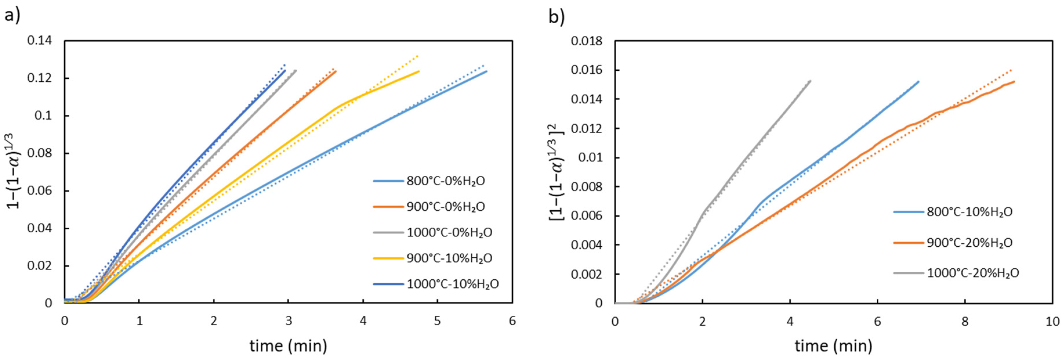 The model fitting for the first stage of reduction is shown in Figure 8. As illustrated in Figure 8(a), when pure hydrogen is used at all temperatures, and when 10% water vapour is used at 900°C and 1000°C, the primary resistance to reduction is due to the chemical reaction. However, for reduction with 10% water vapour at 800°C, and 20% water vapour at 900°C and 1000°C, the controlling mechanism shifts to diffusion. In contrast, for reduction with 20% water vapour at 800°C and 30% water vapour at all temperatures, none of the models listed in Table 3 showed good linearity. This suggests that no single mechanism can fully describe the kinetics under these conditions, indicating that the process is likely controlled by a combination of factors (mix-controlled kinetics).