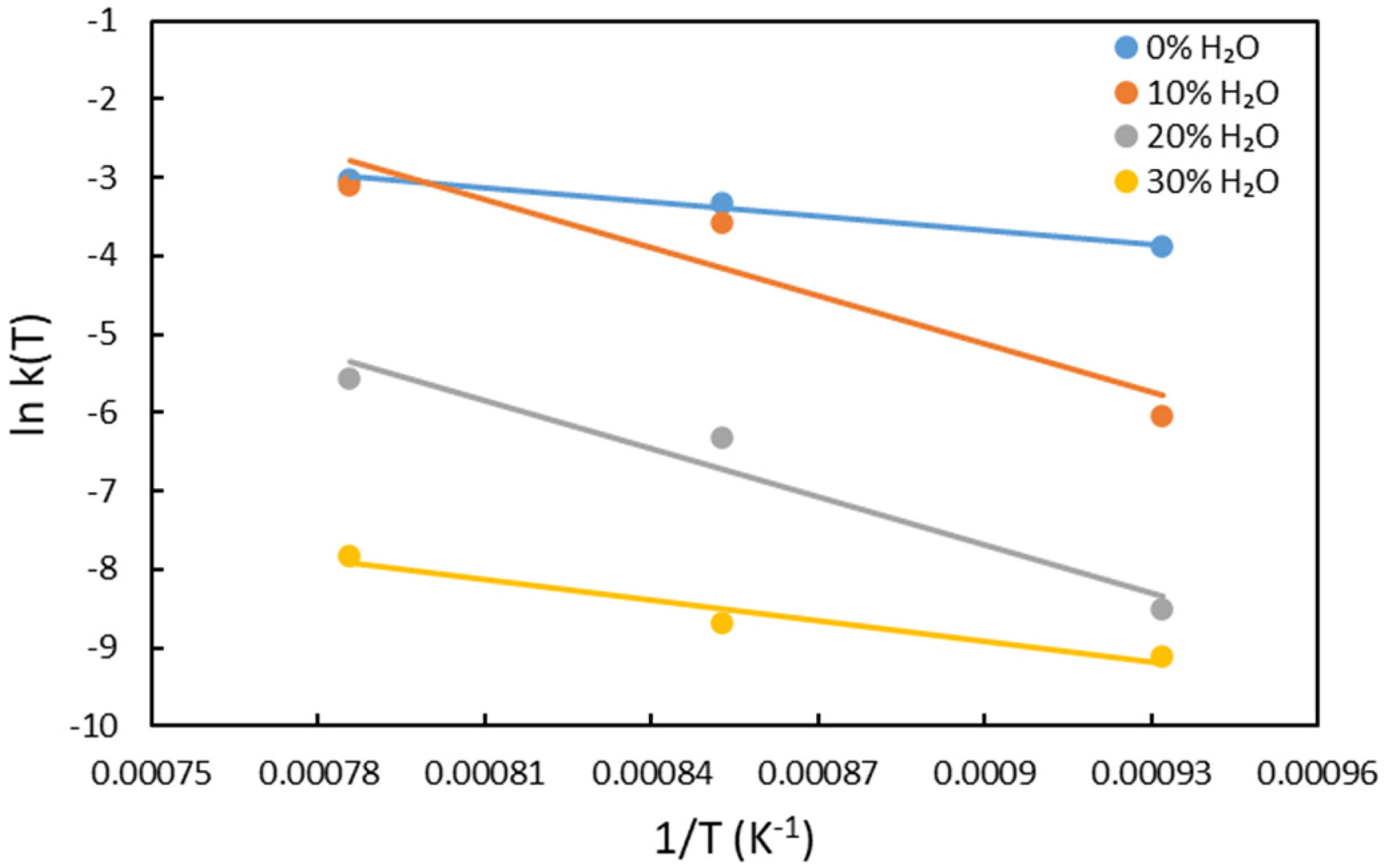 The Arrhenius plots for the second stage of reduction are displayed in Figure 11. From the slope analysis, the activation energy was determined to be 134.65, 145.89 and 177.40 kJ/mol for reductions with 0%, 10% and 20% water vapour, respectively. This indicates that increasing water vapour content leads to a rise in activation energy. Additionally, when compared to the values in Table 3, the calculated activation energies fall within the range associated with solid-state diffusion, which can be attributed to the formation of a solid metallic iron layer on the pellet surface.