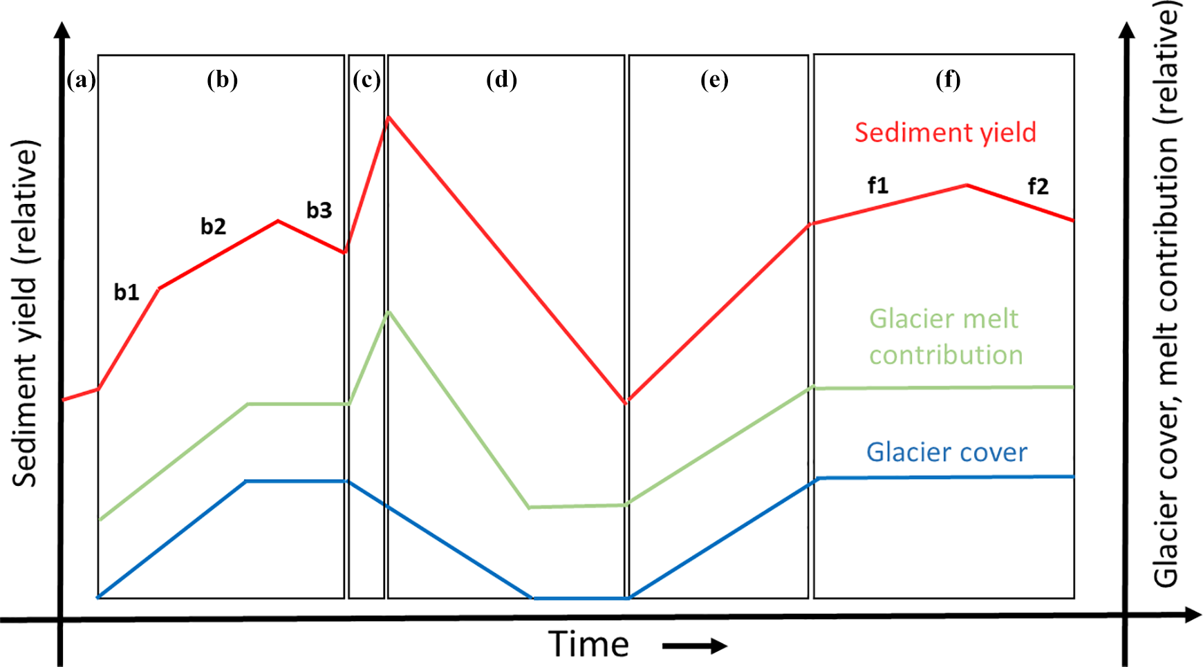 A conceptual model of change in sediment yield during phases of glacier advance, stagnation, retreat and re-advance. Phases (a)–(f) correspond to the six phases highlighted in the conceptual model presented in this manuscript (see also Figure 1). Sediment yield, glacier cover and glacier meltwater contribution are plotted together over a glacial cycle. Rates are relative and have been inspired from the quantitative data of Table 1. Nevertheless, rates are likely to vary (i) within a same glacier setting during multiple glacial cycles and (ii) between different glacier settings during the same glaciation.