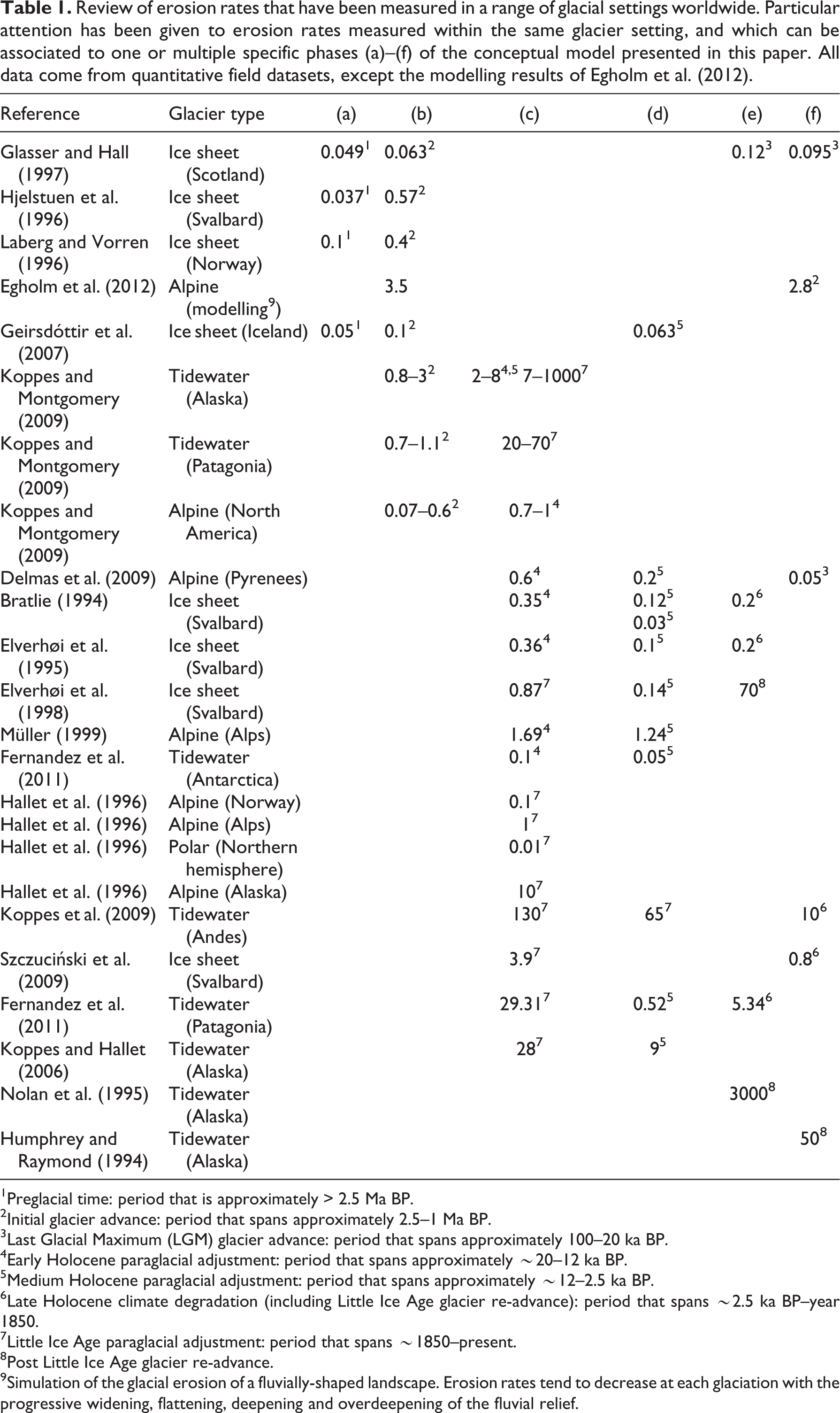 In Table 1, we report erosion rates found in the literature that could be specifically associated to one of the six phases (a)–(f) identified in the conceptual model presented in this paper. In general, we retained publications that presented, for the same glacial setting, erosion rates associated with two or more phases of the glacial cycle (a)–(f), so that they could directly be compared to each other. In some instances, we reported erosion rates for a unique period of the glacial cycle, either because they were representative of a broad range of glacier systems (e.g. numbers in Hallet et al., 1996), or because they were particularly insightful regarding the conceptual model (e.g. numbers in Humphrey and Raymond, 1994; Nolan et al., 1995). All reported erosion rates are based on field datasets (e.g. glacial stream gauging, sedimentological sequences, dating of Quaternary infills), except the modelling exercise by Egholm et al. (2012). Note also that following the argument presented in this paper, the reported erosion rates should be considered as an exported volume of material per unit time comprising a mix of bedrock erosion and reworking of loose sediment (glacial and non-glacial), and not as bedrock erosion only.