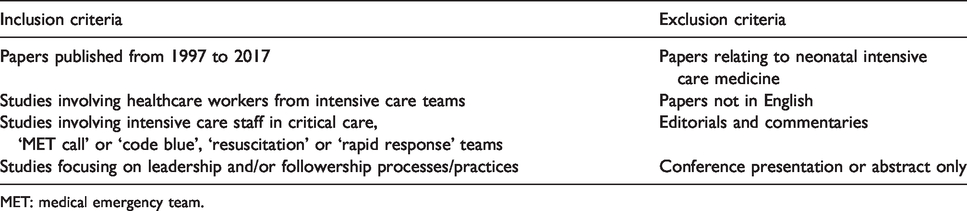Published peer-reviewed papers that explored leadership in intensive care or critical care teams were included in this review. Four databases (Ovid Medline, PsycINFO, Embase and Scopus) were searched in November 2017 for a combination of keywords: ‘leadership’, ‘team leadership’, ‘leadership qualities’, ‘leadership style’, ‘leadership behaviour’, ‘dynamic leadership’ OR ‘distributed leadership’