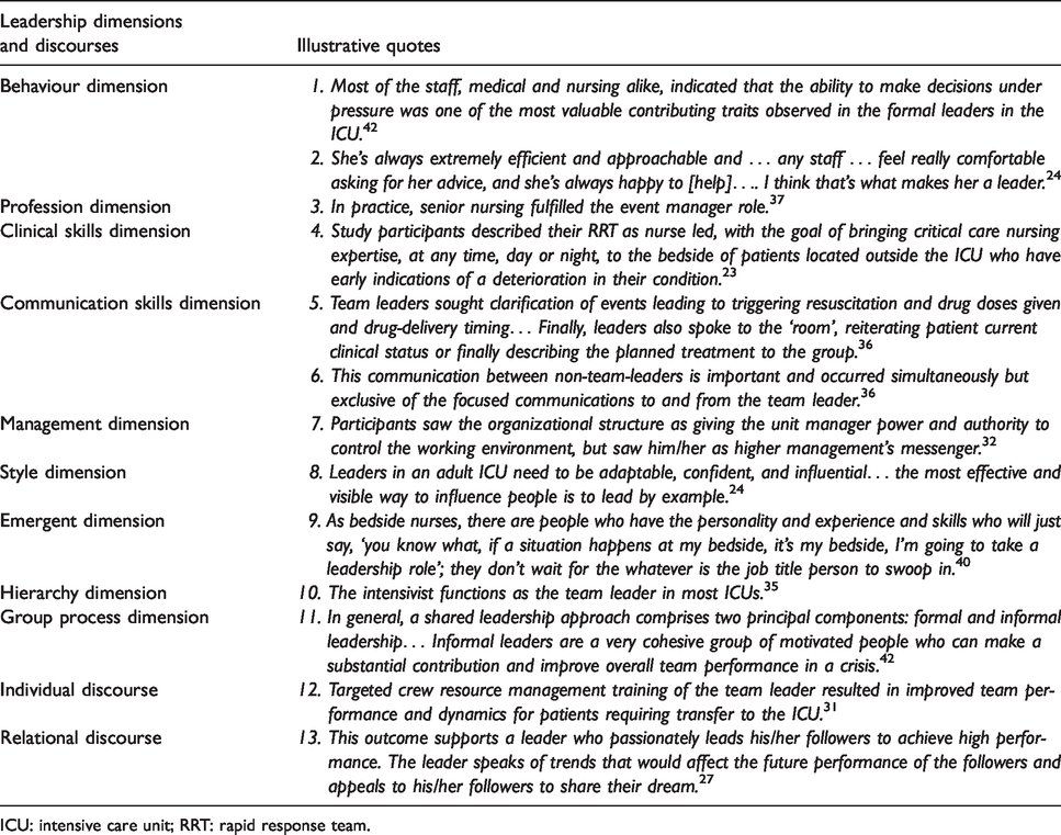 From the coded literature, the ICU workplace (and that of the RRT especially) required team communication, with communication skills being portrayed as a key dimension for leaders and followers (see quotes 5 and 6, Table 3). Conceptualisations of leadership as both traditional hierarchy and emergent shared leadership through group processes were also seen across the papers (see quotes 9 and 10, Table 3). Although leadership as hierarchy was almost specific to papers on medical and mixed cohorts (i.e. not studies with only nursing participants), understandings of leadership as a shared group process were entirely found in studies including nursing professions (see quote 11, Table 3). Conceptualisations of leadership as a shared group process seemed most evident in crisis situations and emergency team performance (such as the RRT).