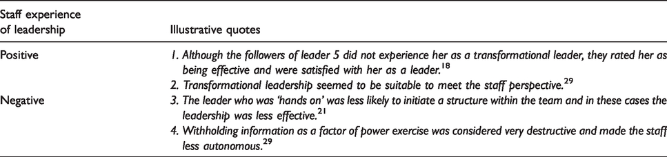Leadership experiences in ICUs were described in about half of the papers with much less frequency than other themes. References to positive, neutral and negative experiences of leadership seemed to be evenly distributed across those papers (see quotes in Table 4). Research into nursing leadership demonstrated a higher dominance of positive leadership experiences reported than was illustrated from medical and mixed participant research. Leadership styles most commonly co-occurred with leadership experiences, both positive (see quotes 1 and 2, Table 4) and negative (see quotes 3 and 4, Table 4). Although not often coded, there seemed to be a link between transformational leadership styles and positive experiences (see quotes 1 and 2, Table 4).