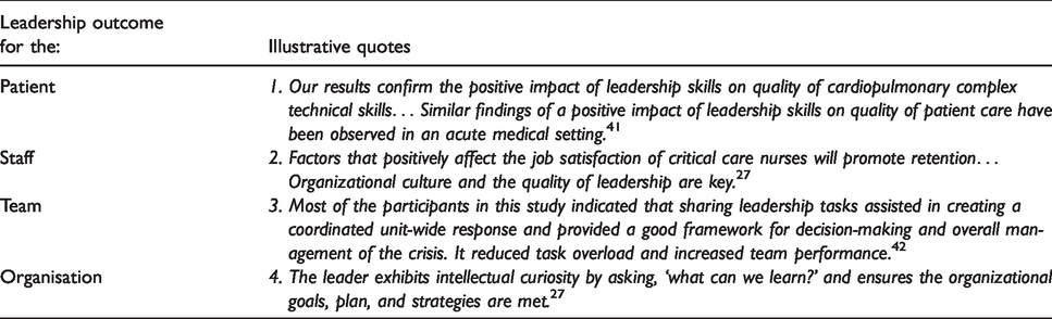 Outcomes of leadership within the ICU were identified in nearly all of the 28 papers and coded as outcomes at four levels: patient, individual, team and organisational (see quotes 1–4, Table 6). Nearly all (88.8%) of the coded leadership outcomes were positive. Positive outcomes for patients following good leadership within the ICU (such as improved resuscitation and patient safety) were predominantly seen in solely medical or mixed participant studies (see quote 1, Table 6), with nursing studies accounting for the majority of positive outcomes for staff (see quote 2, Table 6). Nursing papers illustrated strong links between leadership styles, especially relational styles, and positive staff outcomes such as clinician engagement, job satisfaction and intention to stay in the job (see quote 2, Table 6).