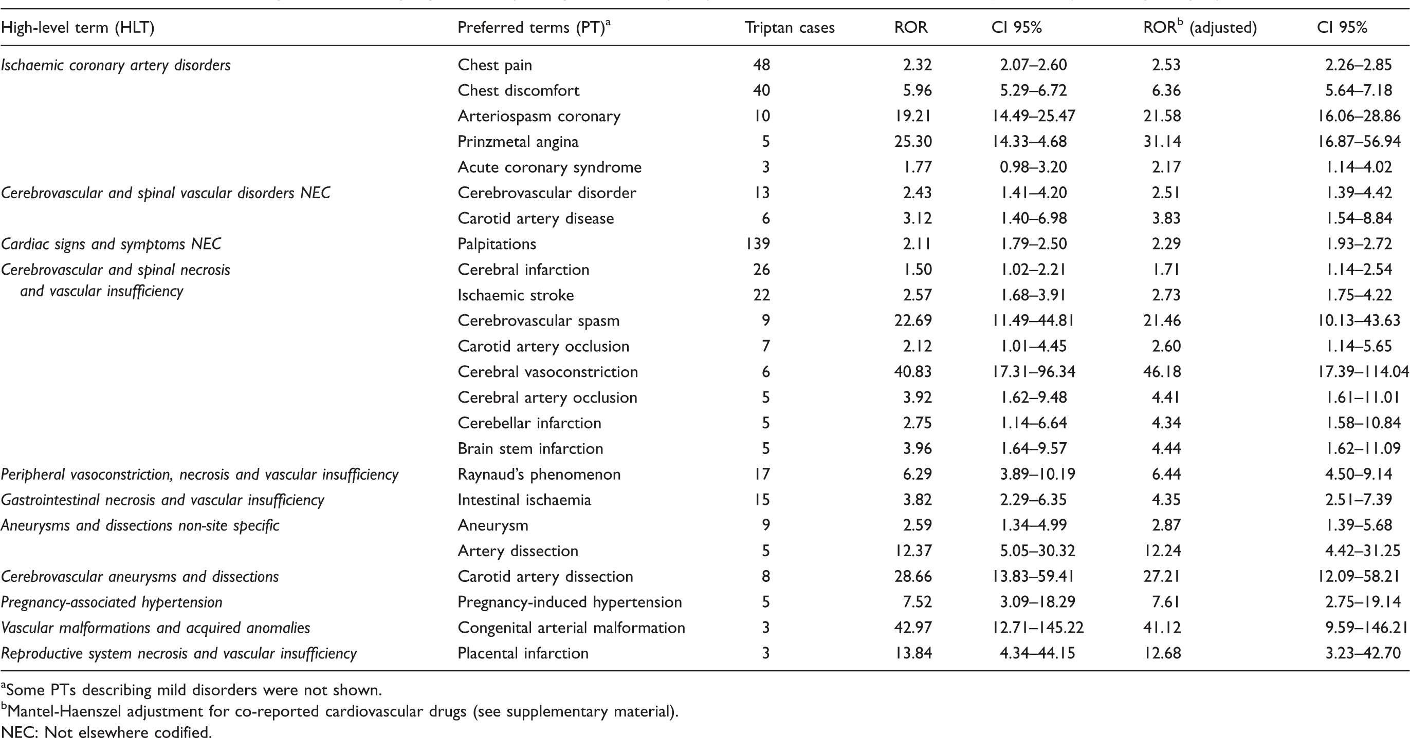 aSome PTs describing mild disorders were not shown. bMantel-Haenszel adjustment for co-reported cardiovascular drugs (see supplementary material). NEC: Not elsewhere codified.
