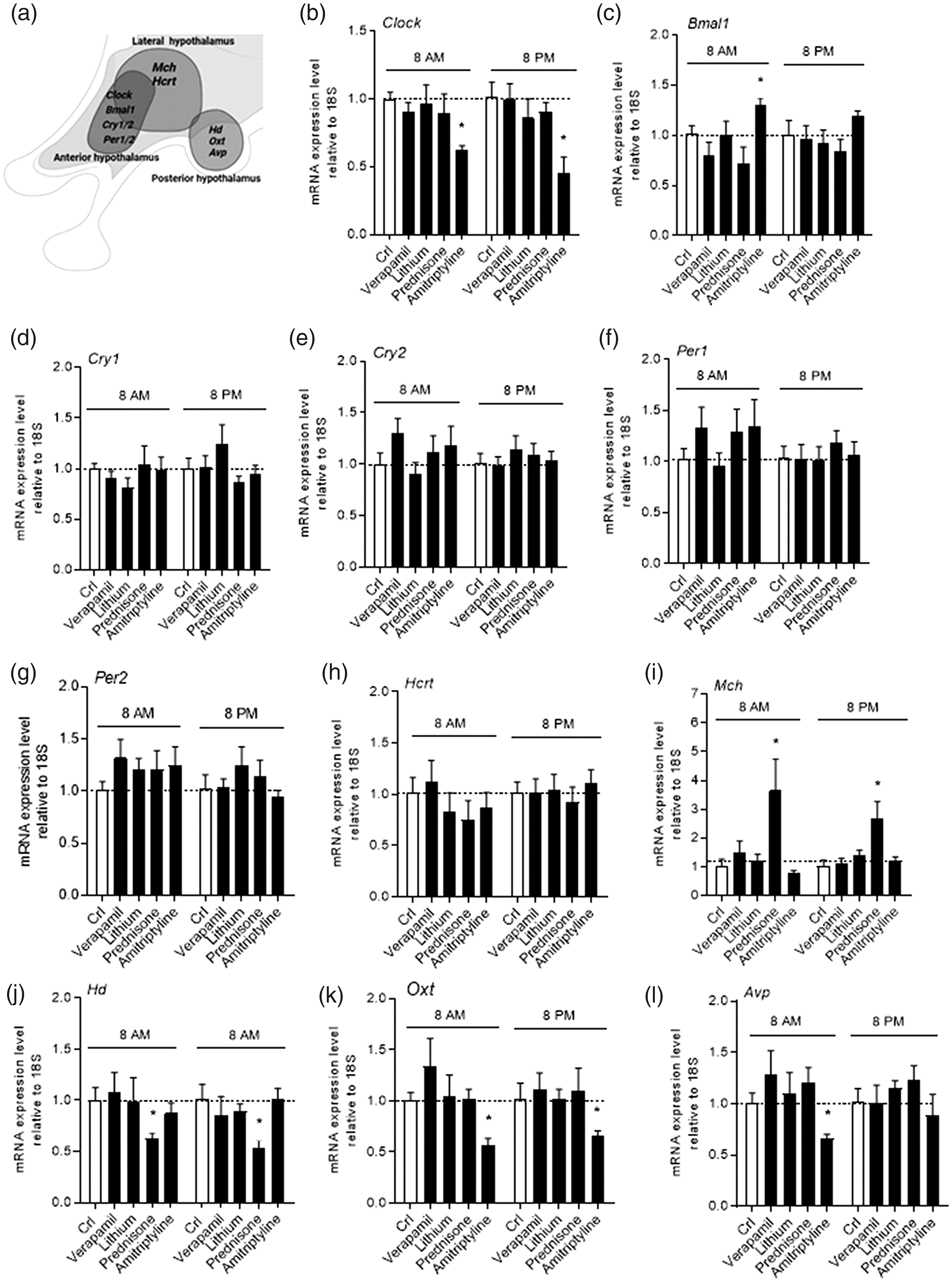 Effects of verapamil, lithium, prednisone, and amitriptyline on gene transcripts involved in hypothalamic chronobiology. The hypothalamic regions (anterior, lateral and posterior) analysed and the respective genes is shown in (a). The impact of a chronic (15 days), oral treatment with verapamil (3.4 mg/kg, three times per day), lithium carbonate (13 mg/kg, three times per day), prednisone (3 mg/kg) or amitriptyline (1 mg/kg) on transcript levels of