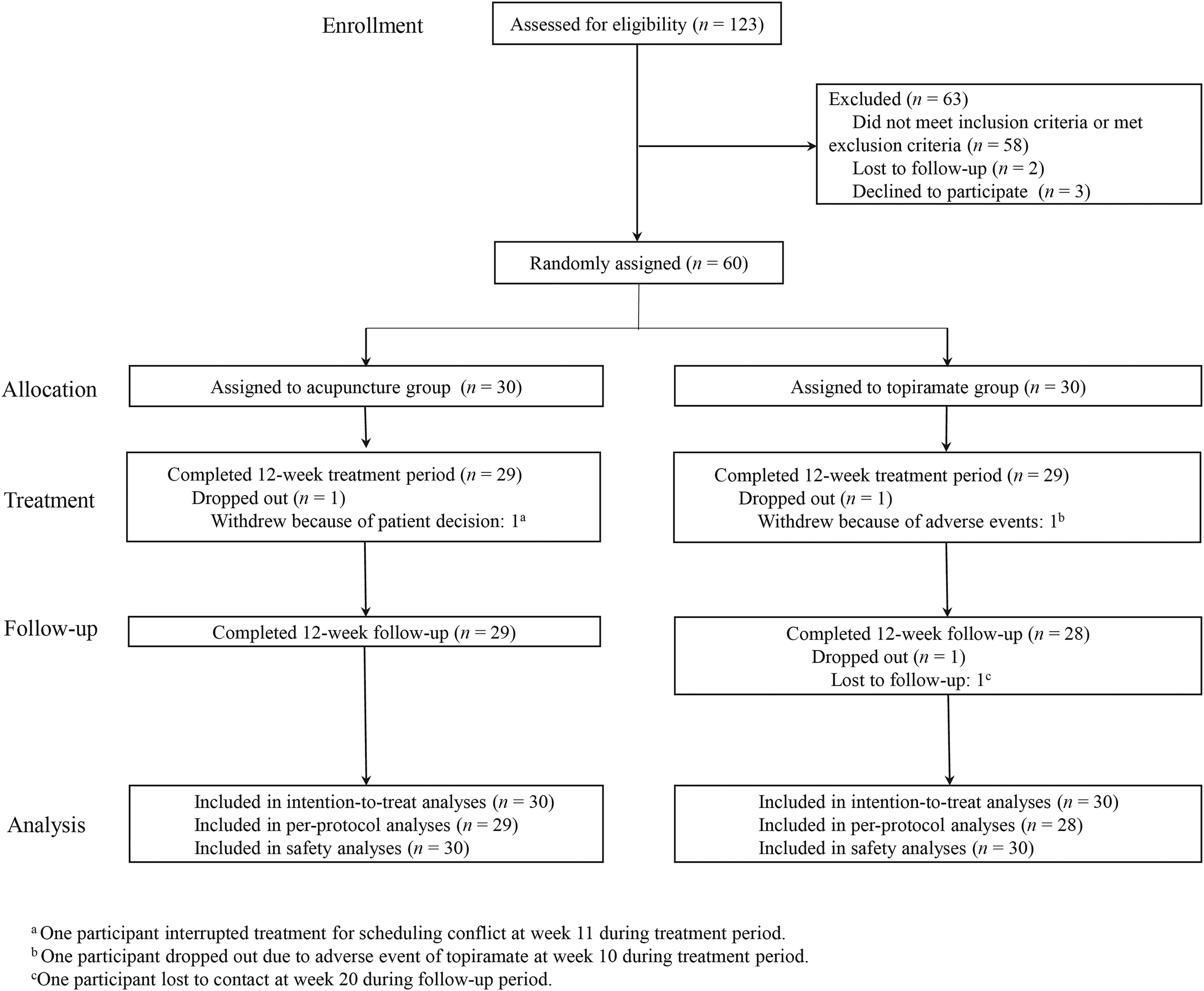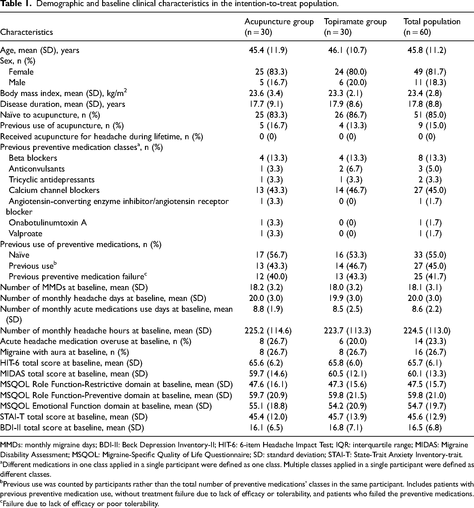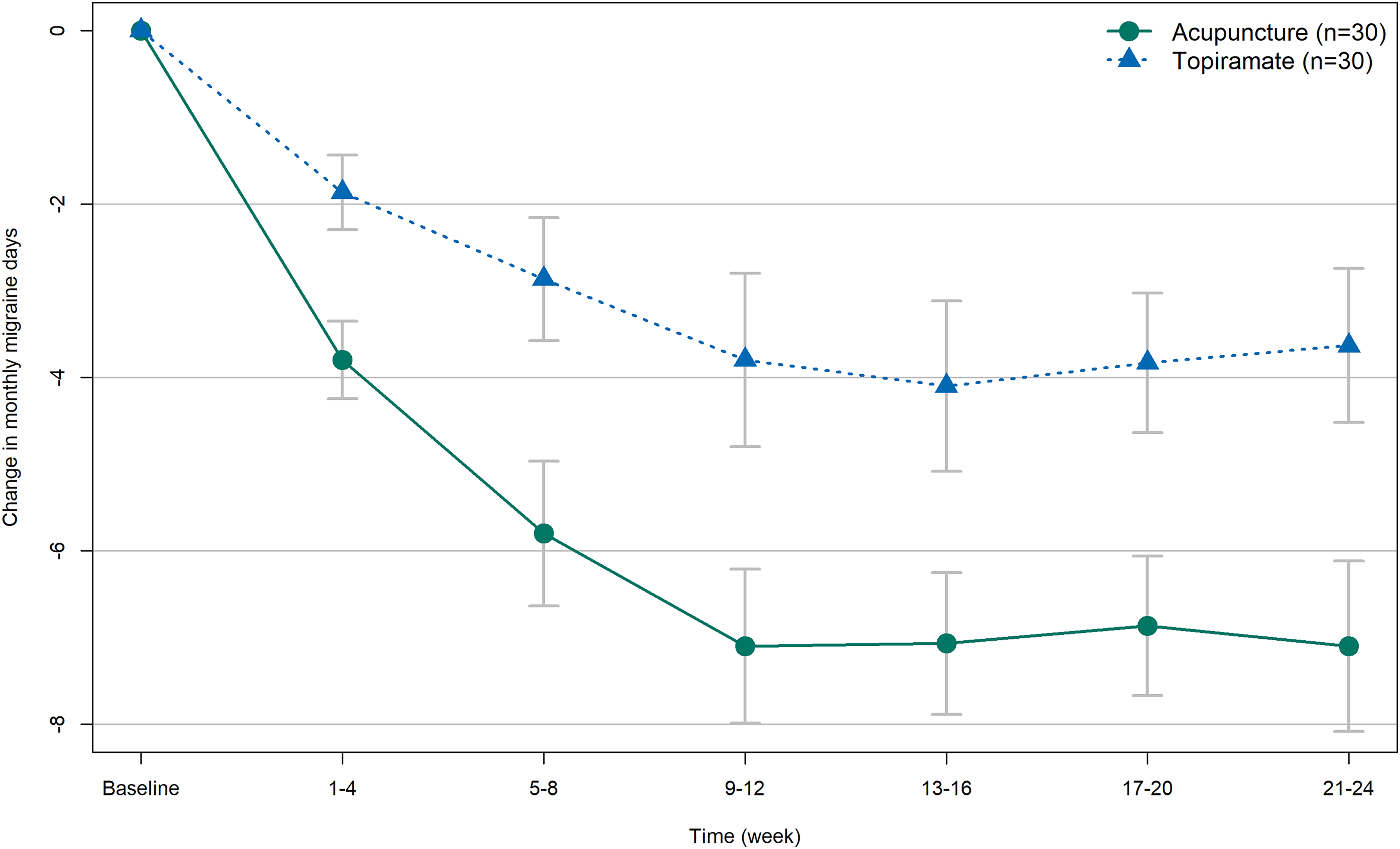 Of 123 screened patients, 60 (mean age 45.8, 81.7% female) were randomly assigned to acupuncture or topiramate groups. Acupuncture demonstrated significantly greater reductions in monthly migraine days than topiramate (weeks 1–12: −2.79 [95% CI: −4.65 to −0.94,