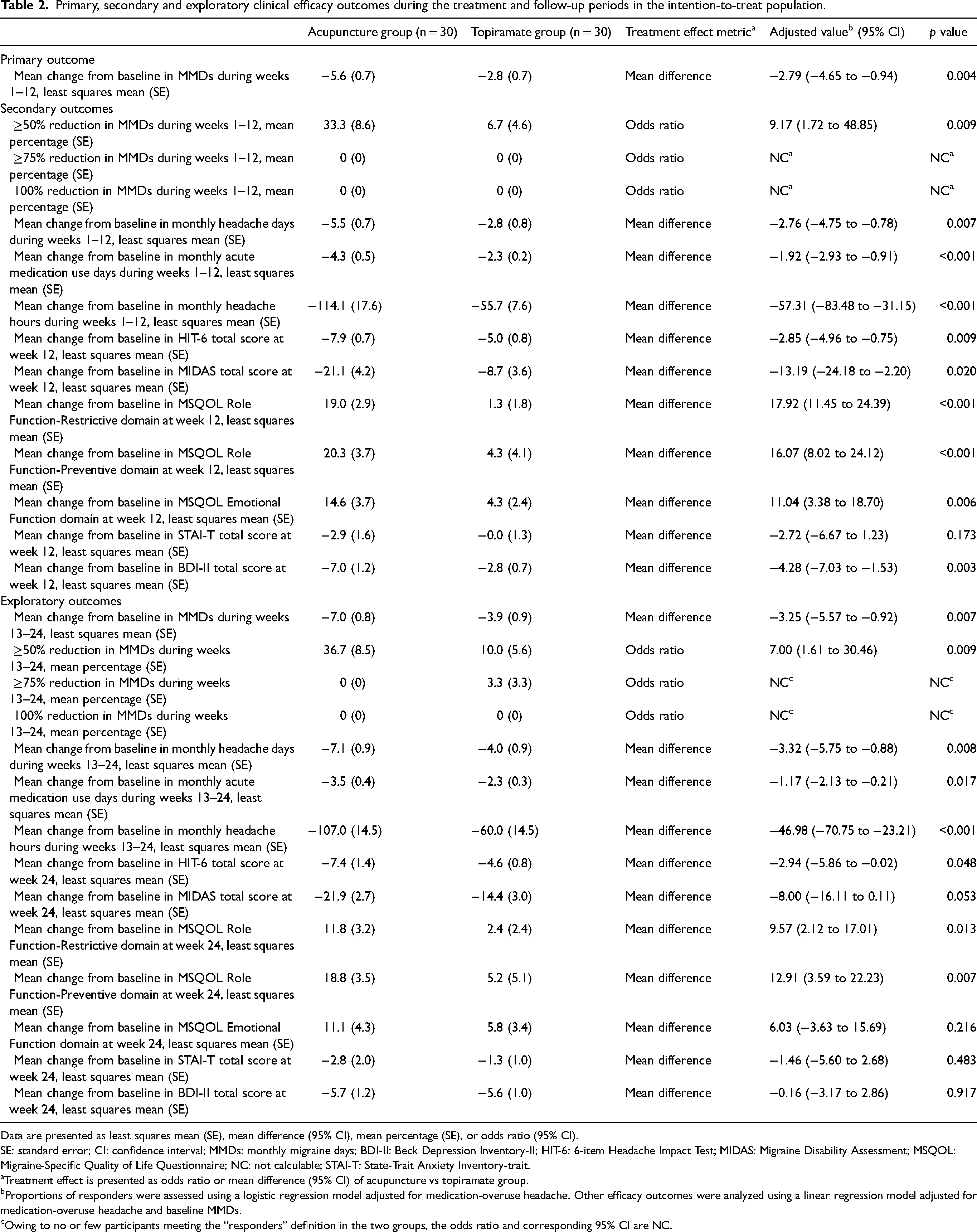 Table 2 summarizes primary, secondary, and exploratory outcomes. Acupuncture, during weeks 1–12, significantly reduced mean MMDs compared to topiramate in the ITT set (LSM difference: −2.79 [95% CI: −4.65 to −0.94];