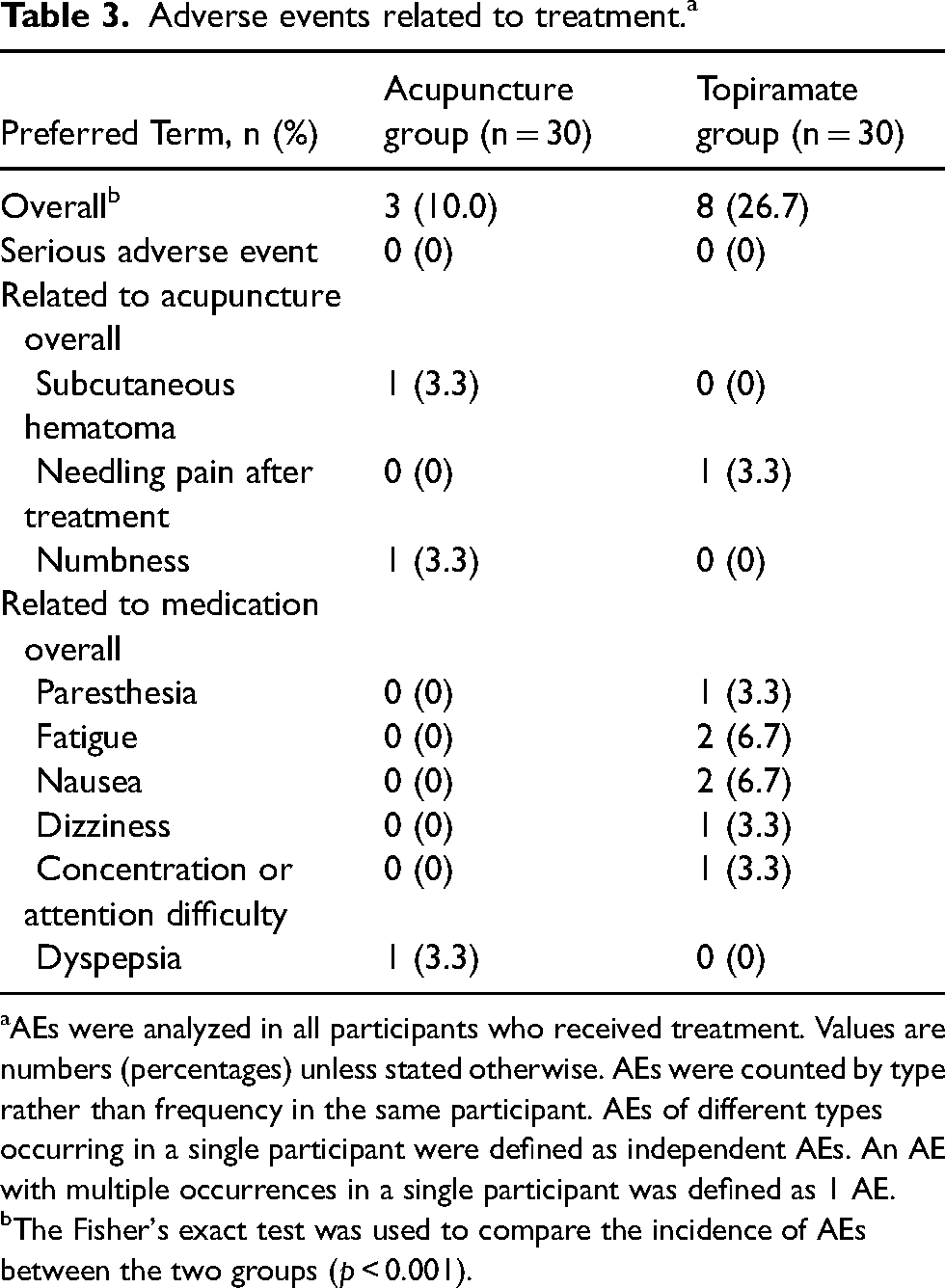Acupuncture group reported fewer AEs (10.0%) than the topiramate group (26.7%), with clinically significant differences (