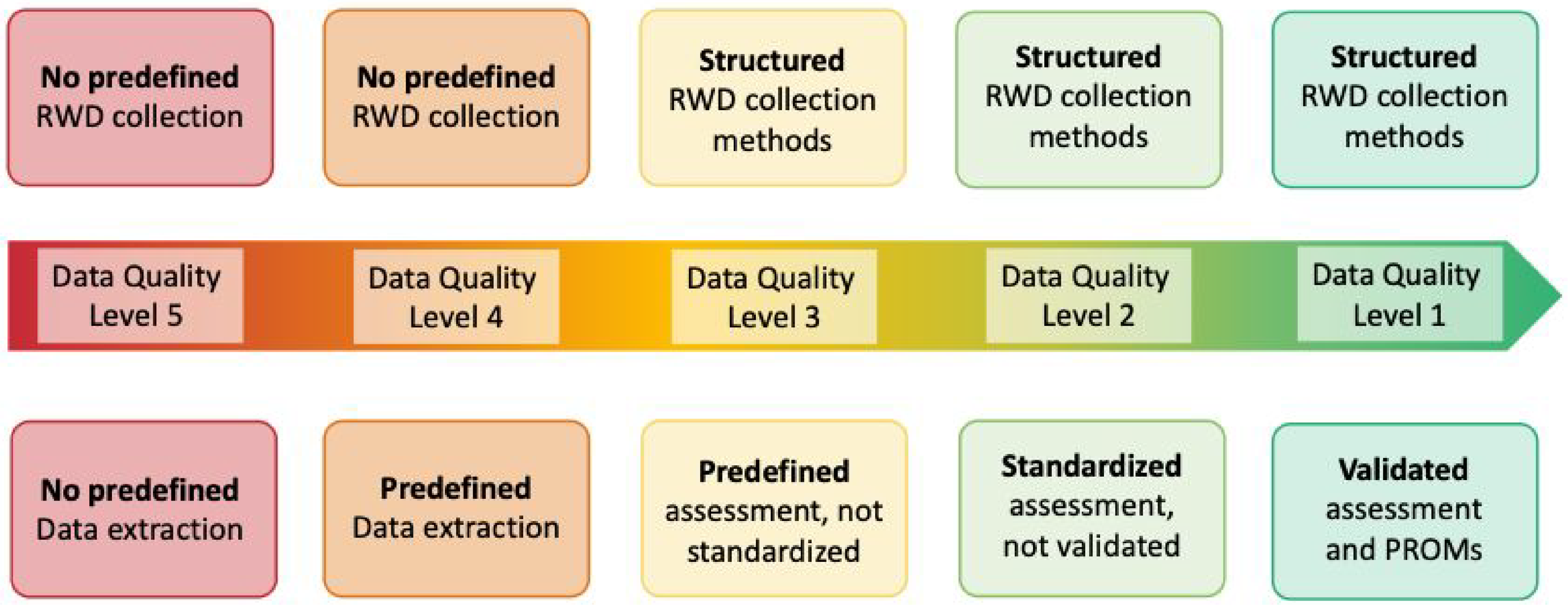 When planning RWE studies, the highest quality level of data collection that is possible to achieve should be implemented (see Figure 1 and comments). When reporting the methodology, it is recommended to specify the quality level of data collection that was used.
