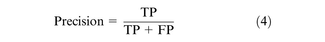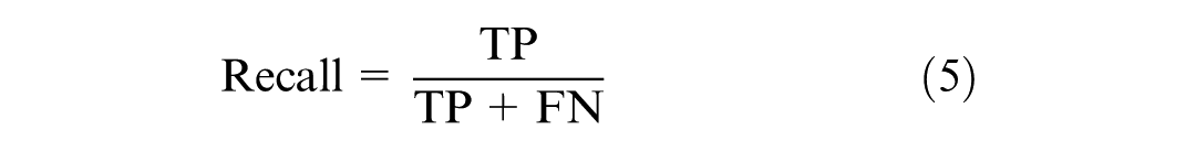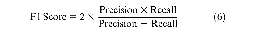 The evaluation of models developed using imbalanced data sets necessitates the use of carefully selected metrics to ensure an accurate and unbiased assessment. Accuracy can be misleading when applied to imbalanced data sets, as it solely reflects the overall rate of correct predictions. Accuracy measures the ratio of correctly predicted instances to the total instances in the data set. To address this issue, precision, recall, and the F1 score are used instead. These metrics are calculated directly from the confusion matrix and do not depend on TN, focusing instead on the model’s performance on both majority and minority classes independently. Precision, as shown in Equation 4, measures the proportion of true positives among all positive predictions. Recall, as illustrated in Equation 5, measures the proportion of true positives among all actual positive instances. The F1 Score, defined in Equation 6, calculates the harmonic mean of precision and recall, providing a balanced measure that accounts for both.