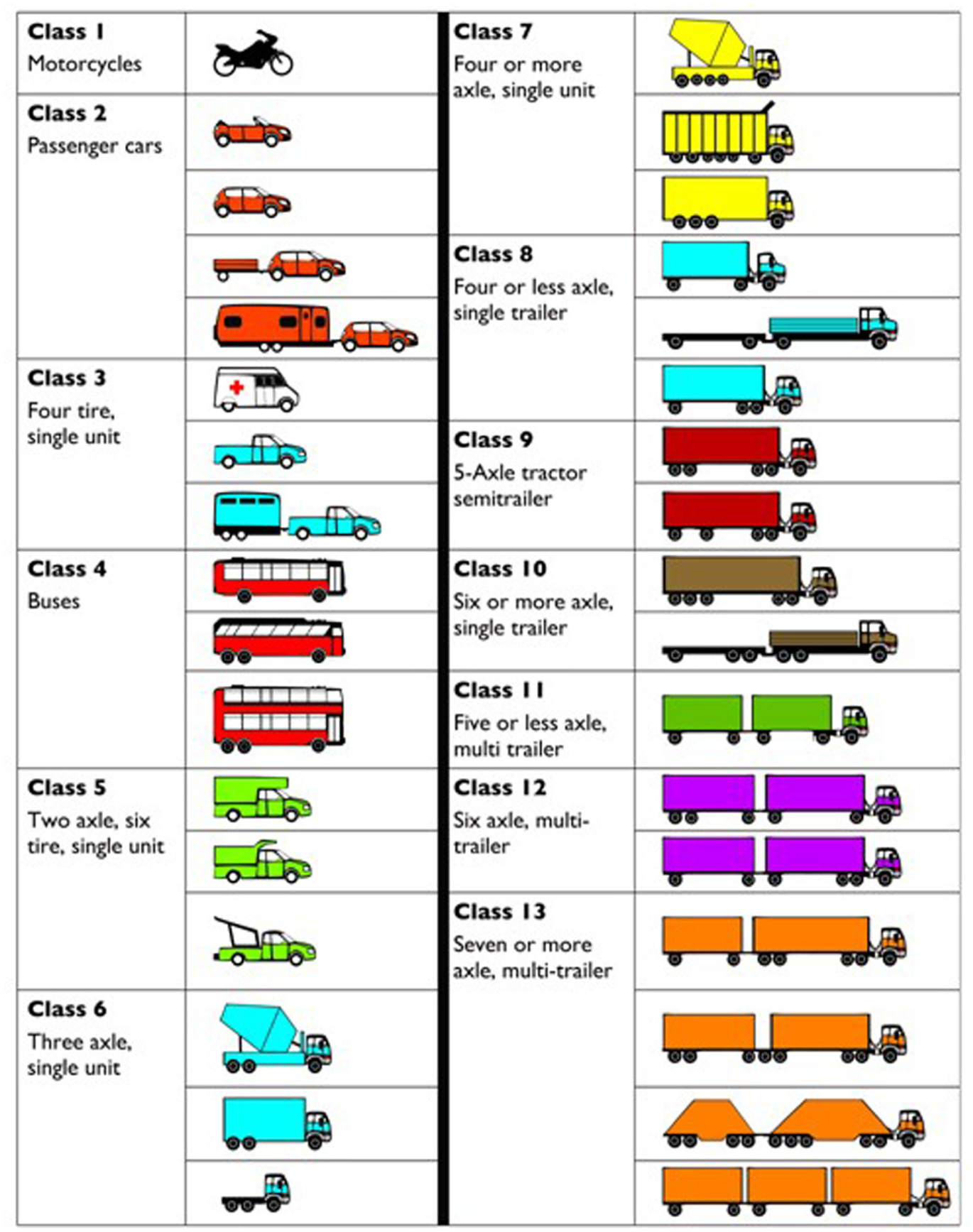 The FHWA introduced a standardized vehicle classification system in the mid-1980s to establish a uniform method for categorizing vehicles based on their physical and functional characteristics. This system organizes vehicles into 13 categories according to the number of axles, axle configurations, and spacing. Federal standardization of vehicle classifications ensures accurate traffic data collection and analysis, essential for various applications such as pavement design, highway maintenance scheduling, predicting commodity flows, highway capacity planning, and weight enforcement strategies (