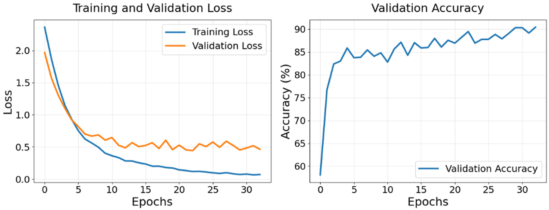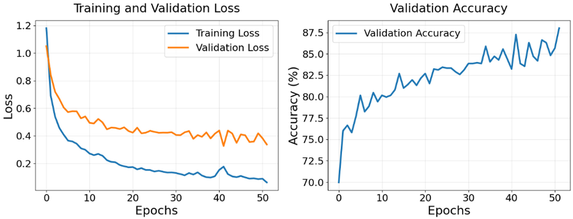 Figures 10–15 illustrate the training and validation loss (left) and validation accuracy (right) for the models. Both the proposed models (Figures 10–12) and the baseline models (Figures 13–15) show consistently decreasing training loss, indicating effective optimization. The validation loss also decreases across all models, with some fluctuations, reflecting efforts to minimize error on unseen data. Validation accuracy improves during the early epochs and stabilizes over time for all models, demonstrating their ability to generalize effectively to validation data. It should be noted that the