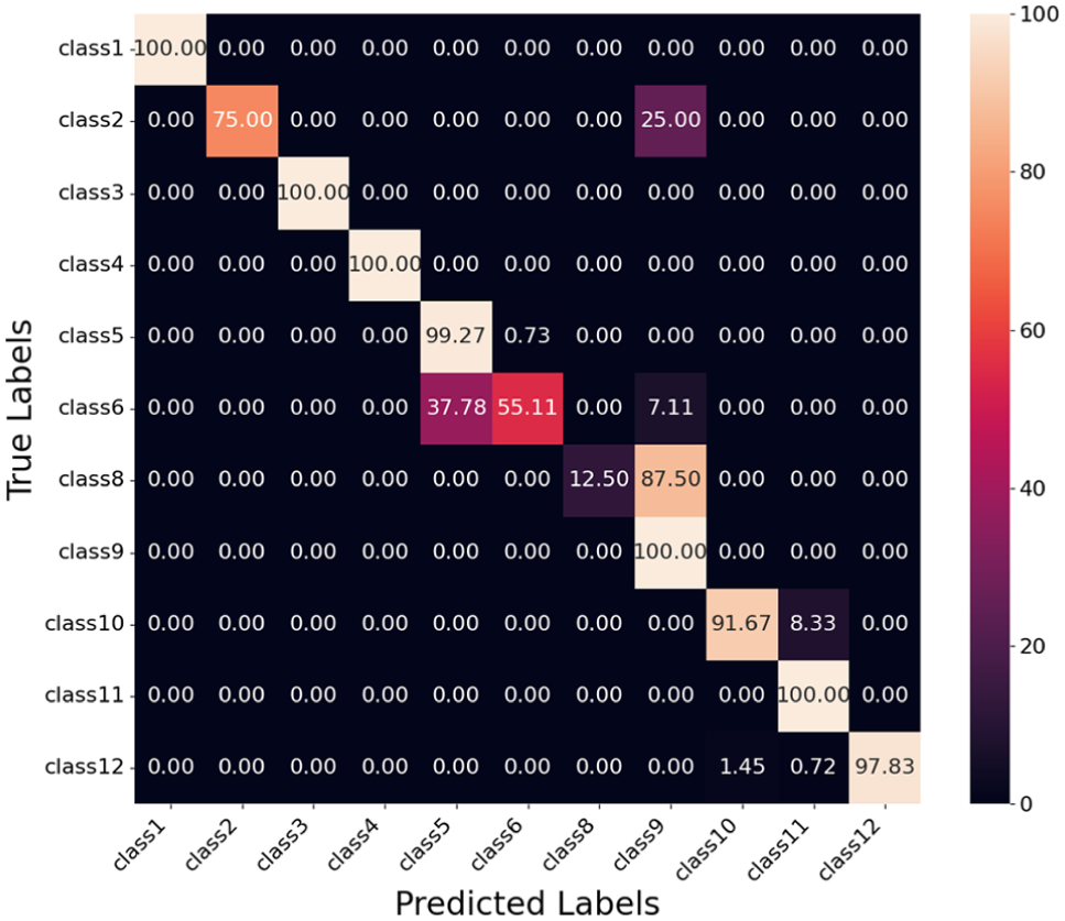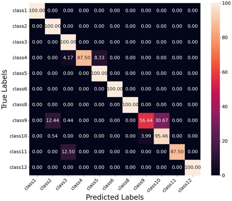 Class 6 shows the lowest F1 score of 0.670, with a precision of 0.929 and a recall of 0.524. This indicates that while the model has high precision for Class 6, it fails to identify a significant number of true instances, as shown by the confusion matrix in Figure 16. Specifically, Class 6 is confused with Class 5 (40.44%) and Class 9 (7.11%). This confusion contributes to the high false negatives for Class 6 and explains its low recall.