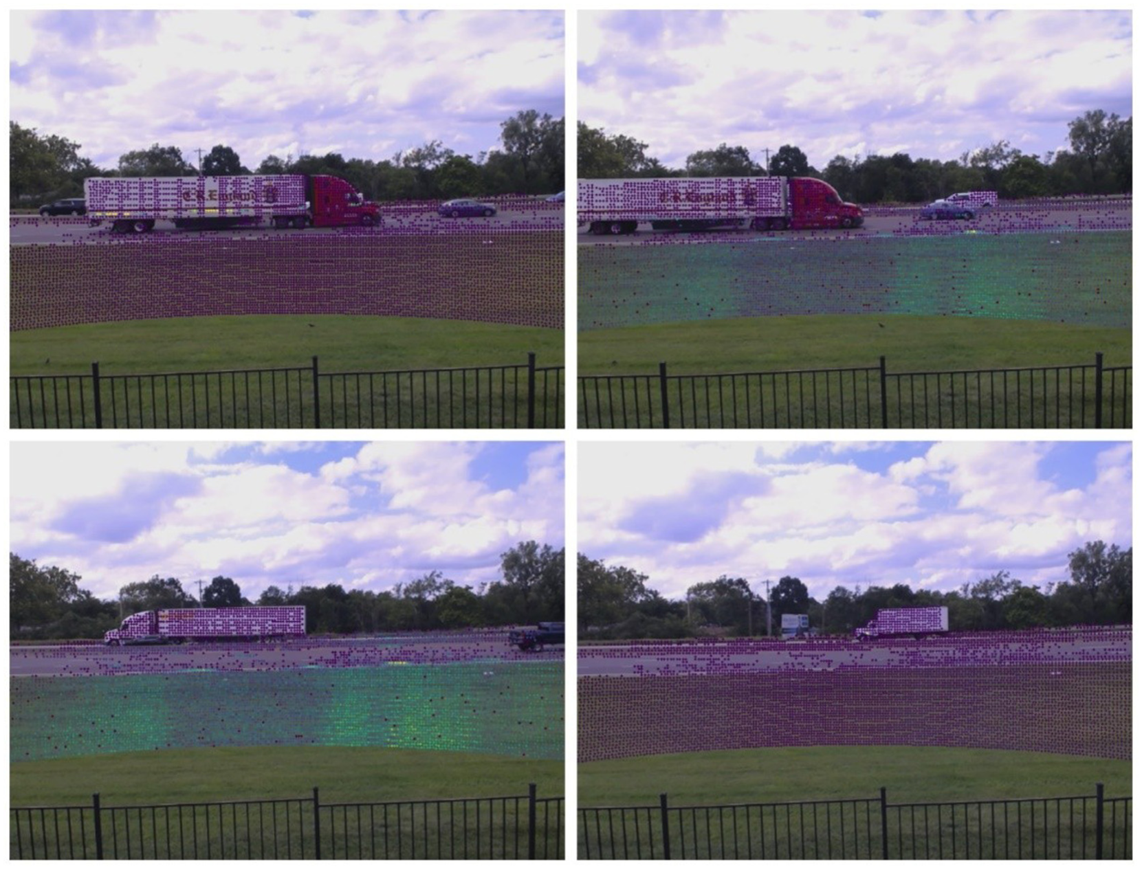 The LiDAR and camera were positioned about 40–70 m from Interstate 70. In the data processing stage, only vehicles in the near lanes were retained, as those farther away often suffered from significant occlusion. The usable data therefore mainly represent vehicles at an effective distance of roughly 40 m from the sensors. At this range, based on the intrinsic parameters of the 640×480 camera and its extrinsic calibration with the LiDAR, each pixel corresponds to about 7.8 cm in both horizontal and vertical directions. Under this geometry, the full image covers approximately 49.9 m across the roadway laterally and 37.5 m vertically, providing sufficient coverage for vehicle observations.