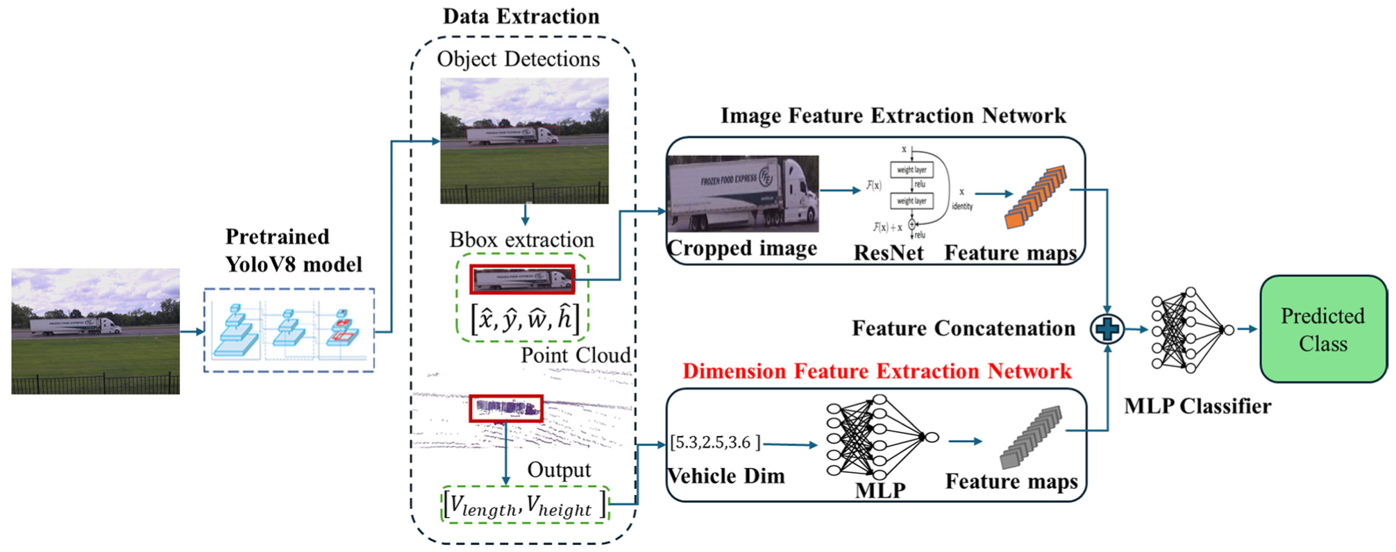 To achieve these objectives, this study develops three different approaches for our fusion methodology. Within this framework, we employ a pretrained YOLOv8 model for vehicle detection in images and use a ResNet model for feature extraction. In the first approach, the localized LiDAR point clouds are used to generate a distance map. This distance map is processed through a multilayer perceptron (MLP) to extract features, which are then concatenated with the image features obtained from the ResNet model. The combined features are input into an MLP classifier to predict the vehicle class. In the second and third approaches, the vehicle dimensions are calculated from the point cloud data. Each point in the point cloud is defined by its (