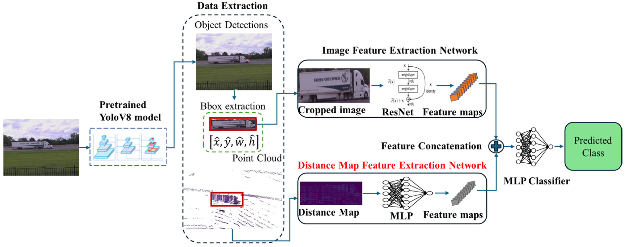In this research, we propose a novel framework that integrates camera and LiDAR data to enhance the accuracy of FHWA axle-based vehicle classification, employing three distinct fusion approaches. Initially, a pretrained YOLOv8 model detects vehicles in images, and a ResNet model extracts features from these localized images. As depicted in Figure 6, the first approach, localized LiDAR point clouds are used to generate a distance map, which is then processed through an MLP to extract features. In the second approach, vehicle length is calculated from the point cloud data by identifying the maximum and minimum points along the vehicle’s longitudinal axis (x-axis). As shown in Figure 7, the third approach extends the second by also calculating vehicle height using the vertical axis (z-axis) in the point cloud data. The extracted features (distance map, length, and height) are converted into feature vectors using an MLP. These vectors are concatenated with the image features from the ResNet model. The combined features are then input into a final MLP classifier to predict the FHWA vehicle class.
