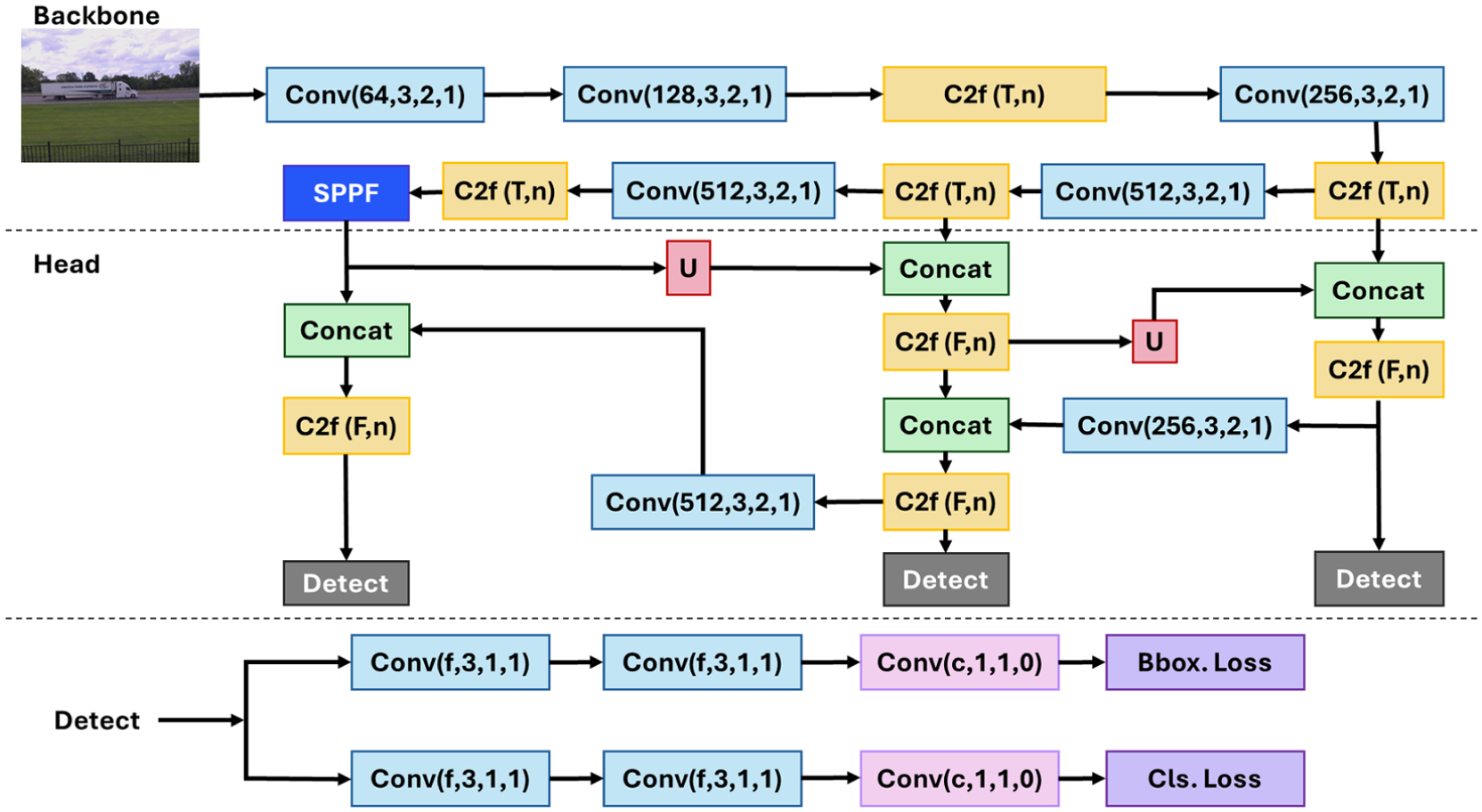 The architecture of YOLOv8, as illustrated in Figure 8, consists of two main components: the Backbone and the Head. The Backbone captures multiscale visual representations through convolutional layers and C2f blocks that integrate convolutional and bottleneck modules to merge high-level features with contextual information, along with a spatial pyramid pooling – fast (SPPF) module that enhances spatial context through pyramid pooling, and a Head that processes these outputs to produce bounding box and class predictions. The Head of YOLOv8 processes the features from the Backbone through a combination of convolutional, C2f, and upsampling layers to generate box and class predictions. Key innovations in YOLOv8, such as anchor-free detection, mosaic augmentation, and self-adversarial training, contribute to its efficiency and effectiveness. It should be noted that our evaluation assesses classification performance only on vehicles successfully detected by YOLOv8, which represented the majority of vehicles in the data set.