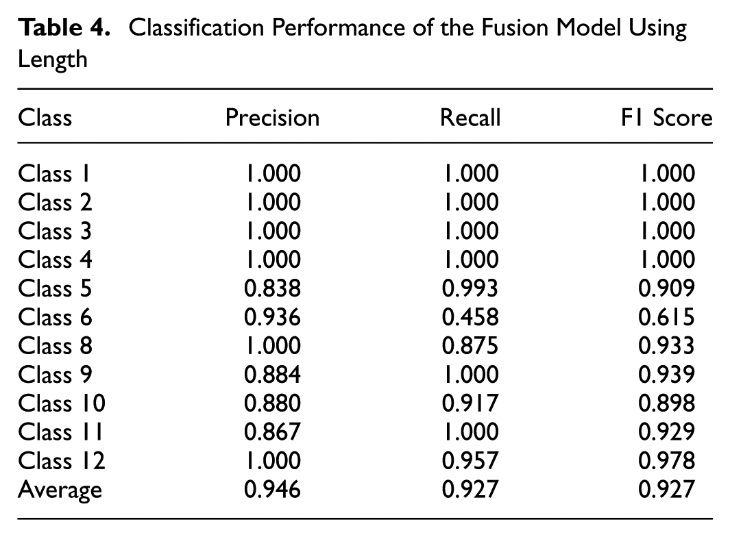 Classification Performance of the Fusion Model Using Length