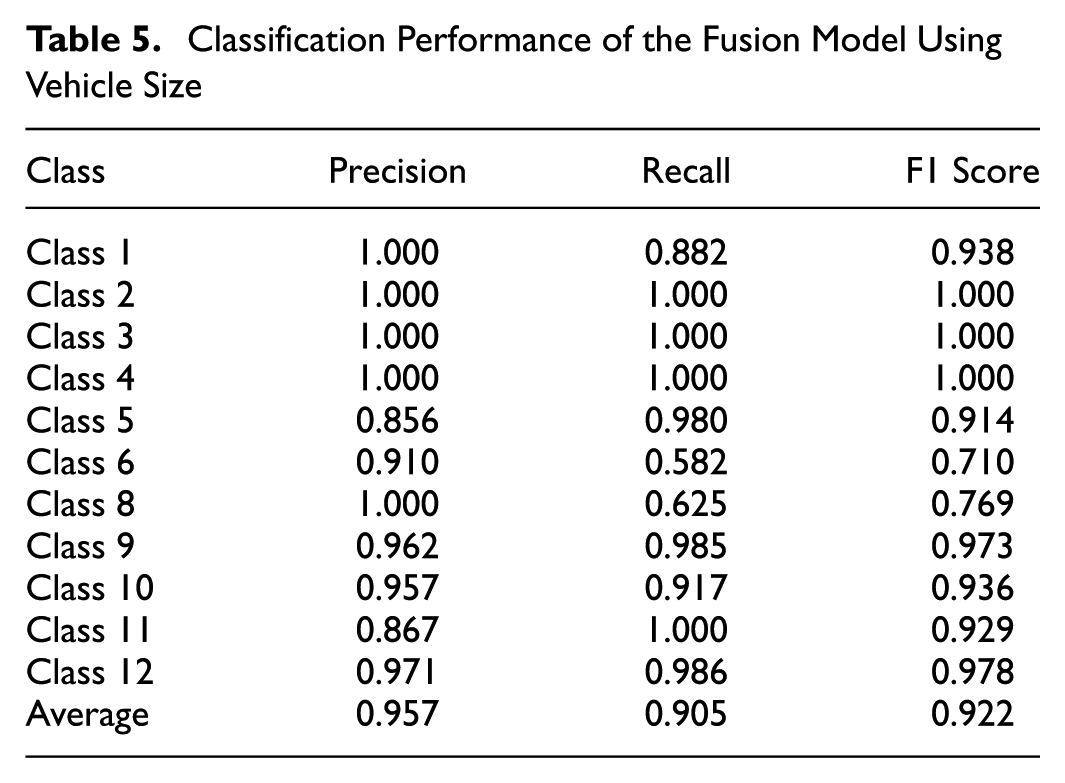 Table 5 presents the classification performance of the fusion model using vehicle size. Classes 2, 3, and 4 achieve perfect precision, recall, and F1 scores of 1.000, demonstrating the model’s ability to classify these classes without errors. Classes 9, 10, 11, and 12 also perform well, with F1 scores of 0.973, 0.936, 0.929, and 0.978, respectively.