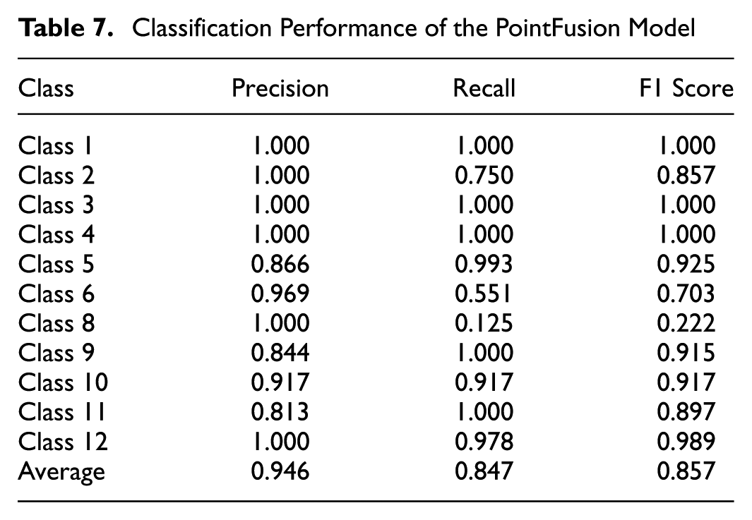Table 7 presents the classification performance of the PointFusion model. Classes 1, 3, and 4 achieve perfect precision, recall, and F1 scores of 1.000, demonstrating that the model effectively classifies these classes without errors. Class 12 also performs well, with an F1 score of 0.989, driven by a precision of 1.000 and a recall of 0.978.