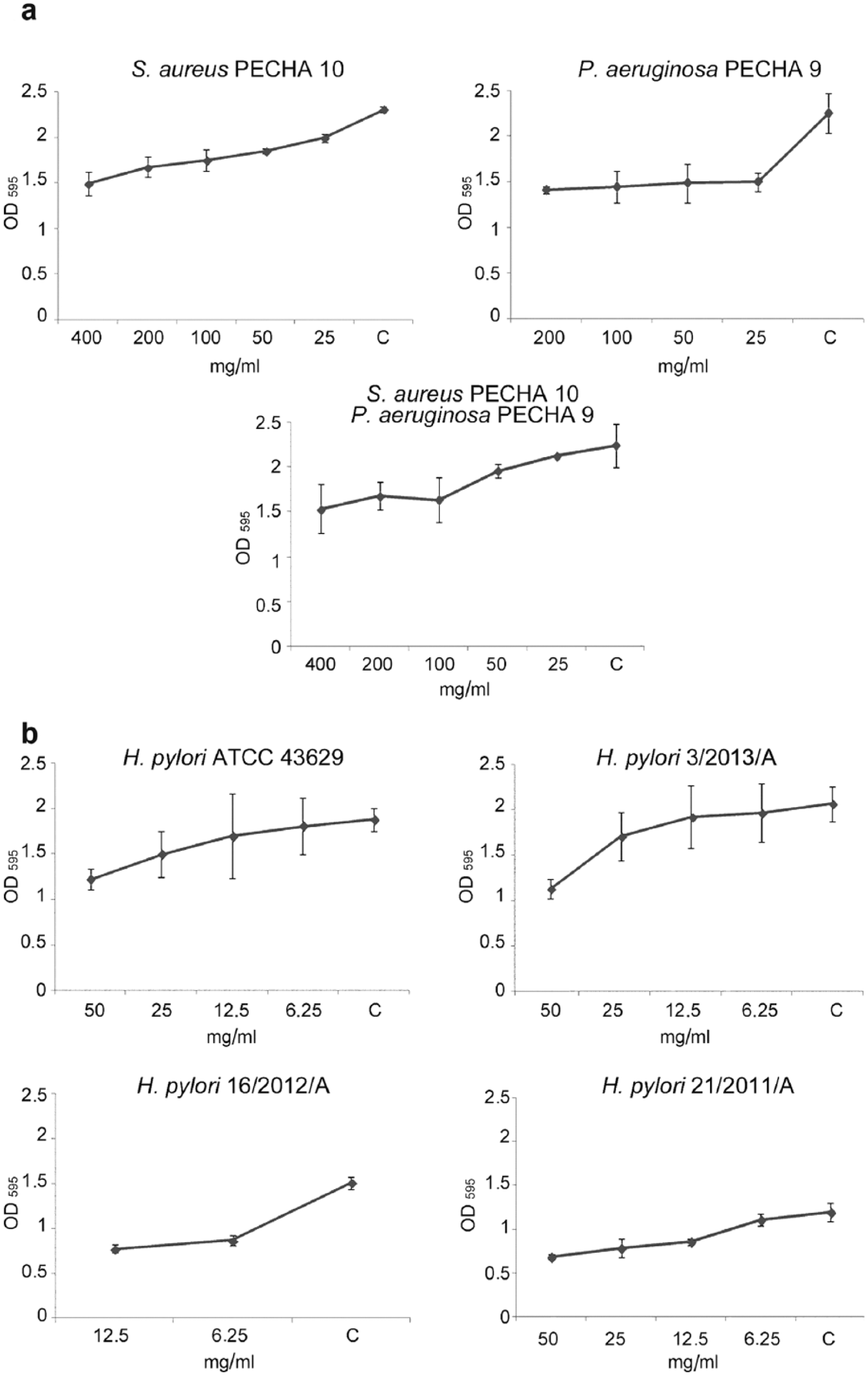 Effect of Aloe vera inner gel on biofilm formation of (a) S. aureus PECHA 10, P. aeruginosa PECHA 9, and their mixture biofilms; (b) H. pylori ATCC 43629, 3/2013/A, 16/2012/A, 21/2011/A. The formed biofilms were analyzed for the biomass production through the crystal-violet staining method. The results were expressed as average of OD595 values of two experiments in duplicate (mean value ± SD; C = control). Probability levels of <0.05 were considered statically significant.