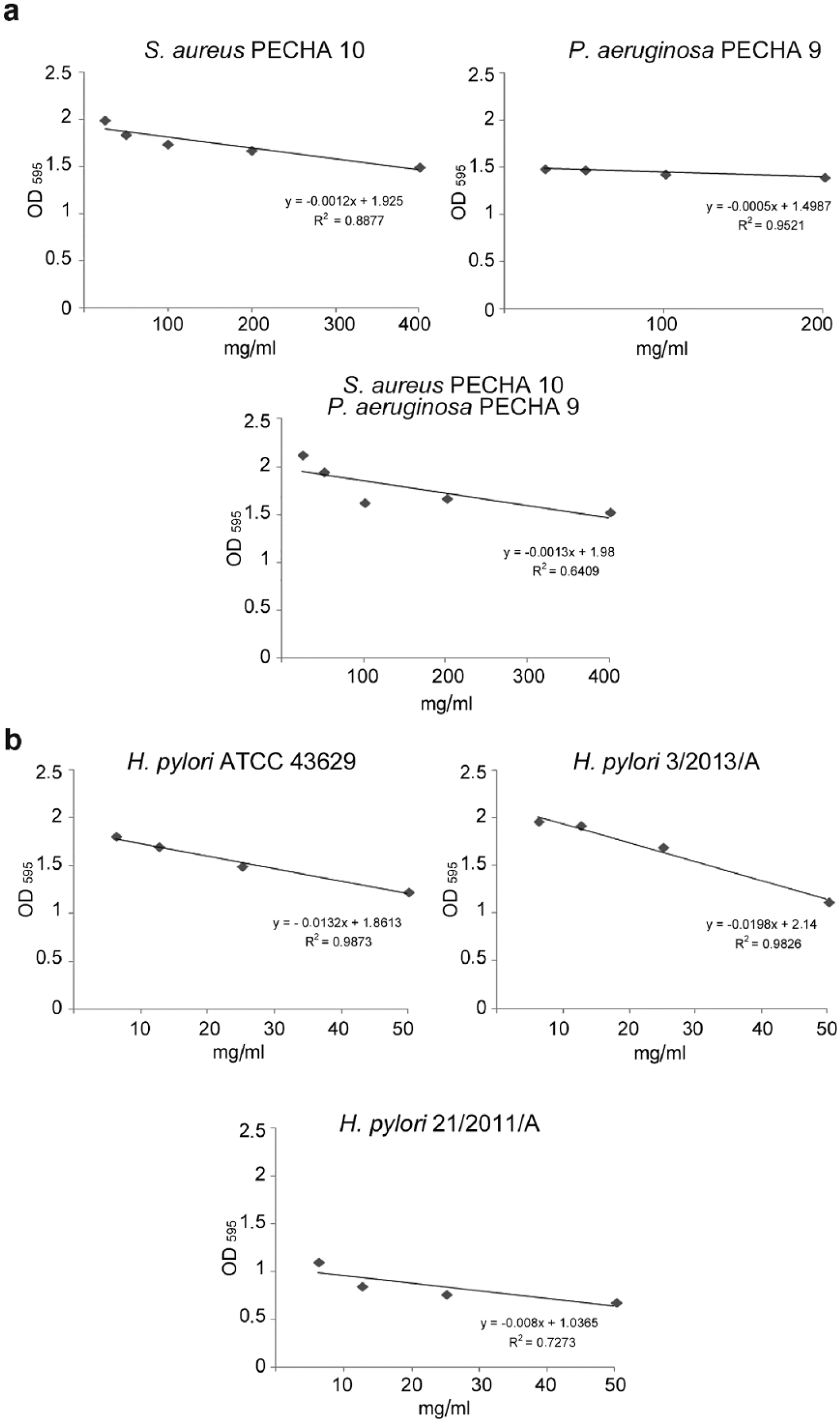 Correlation between biofilm formation and the sub-MIC level of Aloe vera, obtained from method of linear regression analysis, of (a) S. aureus PECHA 10, P. aeruginosa PECHA 9, and their mixture biofilms; (b) H. pylori ATCC 43629, 3/2013/A, 21/2011/A.