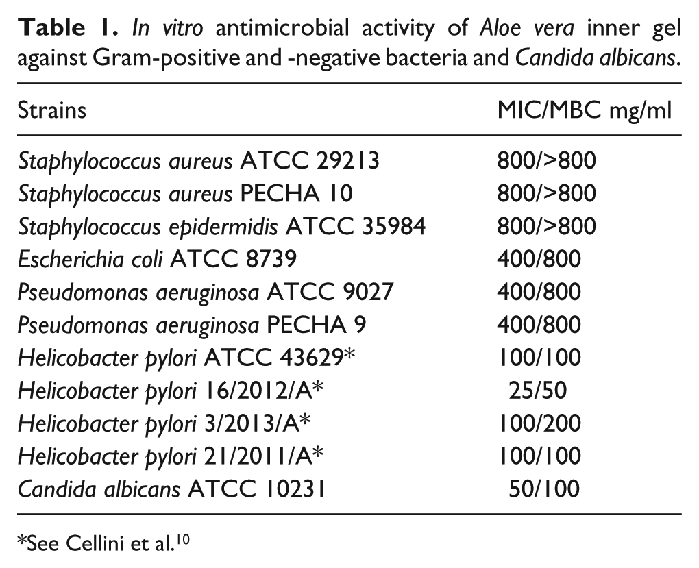 CelliniLDi BartolomeoSDi CampliE. (2014) In vitro activity of Aloe vera inner gel against Helicobacter pylori strains. Letters in Applied Microbiology59: 43–48.