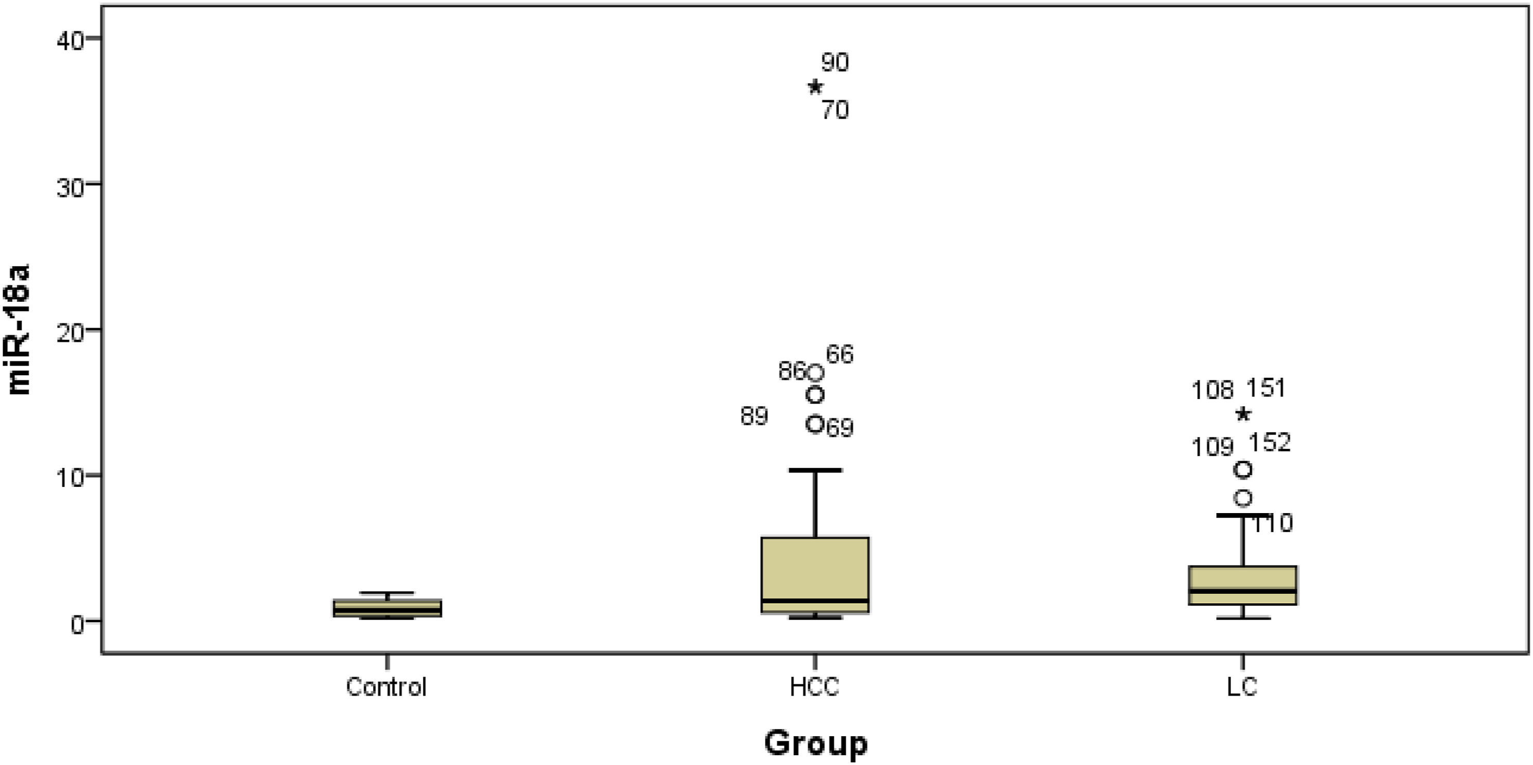 Figures 1 and 2 show the differential expression of miR-18a and miR-222 in different groups. Box plots of ΔCT values of the tested serum miRNAs in patients with liver cirrhosis and those with HCC compared with healthy controls are also depicted. The relative serum range normalized to the internal control miR-16-5p was represented on the Y-axis (ΔCT). The marker was not normally distributed among the studied individuals. The mean values for miR-18a were 3.35 ± 3.4, 4.84 ± 7.89, and 0.89 ± 0.17, and the median values were 2.06, 1.38, and 0.74 for patients with liver cirrhosis, patients with HCC, and healthy controls, respectively. The mean values for miR-222 were 4.73 ± 6.07, 5.64 ± 10.59, and 0.85 ± 0.48, and the median values were 2.38, 2.80, and 0.87 for patients with liver cirrhosis, patients with HCC, and healthy controls, respectively. When we compared the median range of miRNAs in liver cirrhosis or HCC to that of healthy subjects, it was considered significant ( Box plot of miR-18a in the studied groups. LC: Liver cirrhosis, HCC: Hepatocellular carcinoma. Box plot of miR-222 in the studied groups. LC: Liver cirrhosis, HCC: Hepatocellular carcinoma.