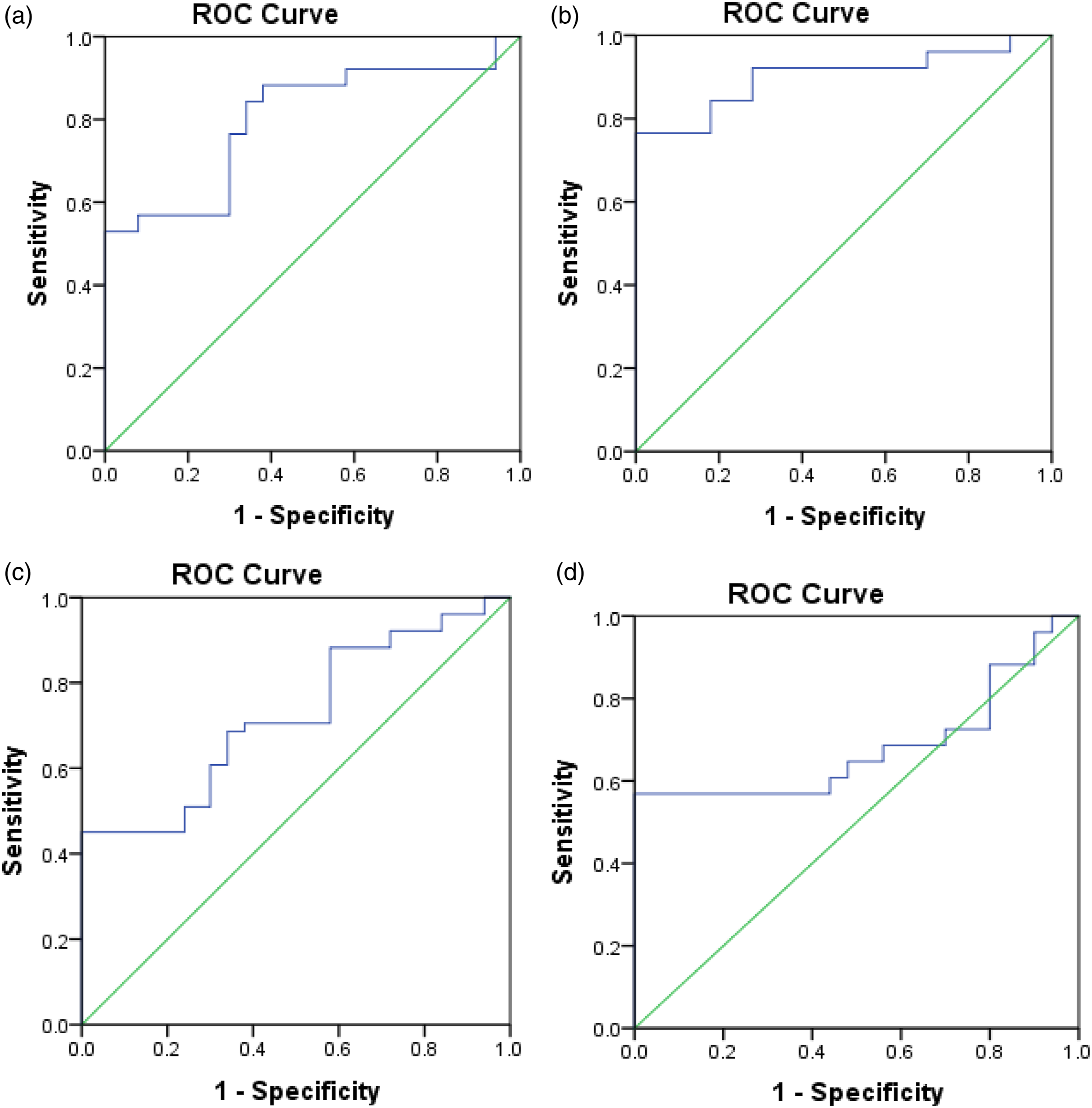 We tried to find an optimal cutoff value using ROC analysis for both miR-18a and miR-222. ROC (Receiver Operating Characteristic) curve for the diagnostic potential of the differentially expressed individual and combined serum miRNAs. (a)miR-18a and (b) miR-222; in discrimination between liver cirrhosis and healthy controls. (c)miR-18a and (d) miR-222; in discrimination between HCC and healthy controls.